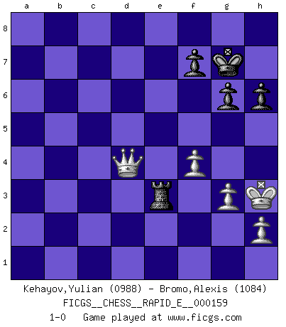 Last move : 1-0 2015 December 11 6:20:53 [Event "FICGS__CHESS__RAPID_E__000159"] [Site "FICGS"] [Date "2015.09.24"] [Round "1"] [White "Kehayov,Yulian"] [Black "Bromo,Alexis"] [Result "1-0"] [WhiteElo "0988"] [BlackElo "1084"] 1.g3 e5 2.Bg2 Nc6 3.e4 Nf6 4.d3 h6 5.Nf3 Bc5 6.O-O O-O 7.a3 a6 8.b4 Bb6 9.c4 Nd4 10.Nxd4 Bxd4 11.Ra2 d6 12.Bb2 b5 13.cxb5 axb5 14.Bxd4 exd4 15.Nd2 Rb8 16.Nb3 Be6 17.f4 c5 18.Re1 Re8 19.bxc5 Bxb3 20.Qxb3 dxc5 21.Rc1 c4 22.dxc4 bxc4 23.Qxc4 Nxe4 24.Rd1 Nc3 25.Rxd4 Rb1+ 26.Bf1 Qxd4+ 27.Qxd4 Nxa2 28.Qd2 R8e1 29.Qxa2 Rxf1+ 30.Kg2 Rg1+ 31.Kh3 Ra1 32.Qf2 Rgb1 33.Qa7 Ra2 34.Qa8+ Kh7 35.Qe4+ g6 36.Qxb1 Rxa3 37.Qb7 Kg7 38.Qb4 Re3 39.Qd4+ 1-0 Benko's Opening Kingside Castling by player White (move 6) Kingside Castling by player Black (move 6) 10 pieces endgame at move 36 : White KQPPP , Black KRPPP WHITE : King + 1 Queen 3 Pawns BLACK : King + 1 Rook 3 Pawns Player White won this chess game. Follow this game move after move (download)Many have become Chess Masters, no one has become the Master of Chess. (Siegbert Tarrasch) Der vorletzte Fehler gewinnt. (Savielly Grigorievitsch Tartakower) Yo creo que el Ajedrez posee una magia que es también una ayuda en la edad avanzada. Una rodilla reumática es olvidada durante una partida de Ajedrez y otros eventos pueden parecer algo sin importancia comparada a una catástrofe en el tablero de Ajedrez. (Vlastimil Hort) Il vaut toujours mieux jouer un plan faux de façon logique que de n'avoir pas de plan du tout. (Victor Kortchnoï) In God we trust, all others we virus scan. (Anonymous)