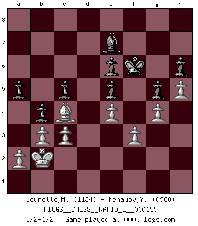 Last move : 1/2-1/2 2015 November 24 19:28:2 [Event "FICGS__CHESS__RAPID_E__000159"] [Site "FICGS"] [Date "2015.09.24"] [Round "1"] [White "Leurette,Marc-Antoine"] [Black "Kehayov,Yulian"] [Result "1/2-1/2"] [WhiteElo "1134"] [BlackElo "0988"] 1.e4 e5 2.Nf3 d6 3.d4 exd4 4.Nxd4 Nf6 5.Nc3 Be7 6.Bd3 O-O 7.Bg5 h6 8.Bxf6 Bxf6 9.Nf3 Nc6 10.Qd2 Ne5 11.Nxe5 dxe5 12.O-O-O Be6 13.Kb1 c6 14.h4 b5 15.f3 a5 16.b3 b4 17.Na4 Rb8 18.Nc5 Be7 19.Nxe6 fxe6 20.g4 g5 21.Bc4 Qxd2 22.Rxd2 Kf7 23.h5 Kf6 24.Rd7 Rfd8 25.Rc7 Rbc8 26.Rxc8 Rxc8 27.Rd1 Rd8 28.Rxd8 Bxd8 29.Kb2 c5 30.c3 Be7 1/2-1/2 Philidor : Exchange variation Kingside Castling by player Black (move 6) Queenside Castling by player White (move 12) This chess game ended in a draw. Follow this game move after move (download)Chess, like love, is infectious at any age. (Flohr) Vielleicht wirkt die Aura früherer Spieler glanzvoller als die der heutigen Spieler, aber das liegt daran, dass man kein Programm wie Fritz hatte, das einem all die Löcher in ihren Partien zeigt. (Vladimir Kramnik) Jugadores de primera clase pierden en contra de jugadores de segunda clase porque los jugadores de segunda clase a veces juegan una partida de primer clase. (Siegbert Tarrasch) 'L'échange des dames est un coup dur pour les deux adversaires...' Un journaliste lors d'une partie du match Spassky-Fischer May I never be complete. May I never be content. May I never be perfect. Deliver me, Tyler, from being perfect and complete. (Chuck Palahniuk, Fight Club)