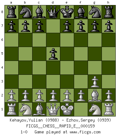 Last move : 1-0 2015 October 26 14:57:55 [Event "FICGS__CHESS__RAPID_E__000159"] [Site "FICGS"] [Date "2015.09.24"] [Round "1"] [White "Kehayov,Yulian"] [Black "Ezhov,Sergey"] [Result "1-0"] [WhiteElo "0988"] [BlackElo "0939"] 1.g3 d5 2.Bg2 1-0 This chess game has been lost on time (started : 2015.09.24 14:44:44) Benko's Opening Player White won this chess game. Follow this game move after move (download)Chess, like love, like music, has the power to make people happy. (Siegbert Tarrasch) Wenn ich Weiß habe gewinne ich weil ich Weiß habe, wenn ich Schwarz habe gewinne ich weil ich Bogoljubov bin. (Efim Bogoljubov) Fischer es el jugador mas fuerte del mundo. De hecho, el jugador mas fuerte que jamas haya existido. (Larry Evans) Les échecs, c'est l'imagination. (David Bronstein) See no evil, hear no evil, speak no evil. (The 3 monkeys)