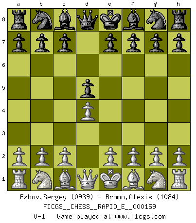 Last move : 0-1 2015 October 26 2:56:39 [Event "FICGS__CHESS__RAPID_E__000159"] [Site "FICGS"] [Date "2015.09.24"] [Round "1"] [White "Ezhov,Sergey"] [Black "Bromo,Alexis"] [Result "0-1"] [WhiteElo "0939"] [BlackElo "1084"] 1.d4 d5 0-1 This chess game has been lost on time (started : 2015.09.24 14:44:44) Queen's pawn game Player Black won this chess game. Follow this game move after move (download)It's always better to sacrifice your opponent's men. (Savielly Tartakover) Später, ... hatte ich zunehmend Erfolg in entscheidenden Partien. Vielleicht weil ich eine einfache Wahrheit erkannte: nicht nur ich hatte Angst, auch mein Gegner. (Mikhail Nekhemyevich Tal) Con el fin de mejorar tu juego, debes de estudiar los finales antes que todo, ya que mientras que los finales pueden ser estudiados y dominados por sí mismos, el juegomedio y la apertura deben de ser estudiados en relación con los finales. (José Raúl Capablanca) Il n'y a plus de joueurs du niveau de Jacob Murray dont la seule quête est le beau jeu, le plaisir de voir les pièces construire quelque chose. Sur 10 idées à la minute, 9 seront sans intérêt, la dernière s'avèrera géniale. (Christian Bauer) Luck is the residue of design. (John Milton)