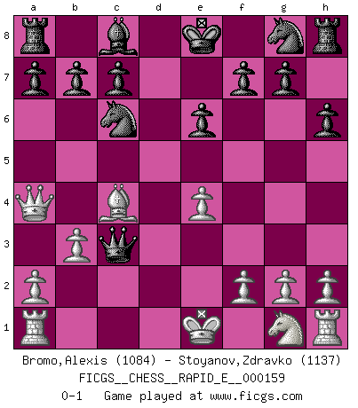 Last move : 0-1 2015 September 29 20:5:57 [Event "FICGS__CHESS__RAPID_E__000159"] [Site "FICGS"] [Date "2015.09.24"] [Round "1"] [White "Bromo,Alexis"] [Black "Stoyanov,Zdravko"] [Result "0-1"] [WhiteElo "1084"] [BlackElo "1137"] 1.d4 d5 2.c4 dxc4 3.Nc3 e6 4.e4 h6 5.Bxc4 Bb4 6.Bd2 Qxd4 7.Qa4+ Nc6 8.b3 Bxc3 9.Bxc3 Qxc3+ 0-1 Queen's gambit accepted Player Black won this chess game. Follow this game move after move (download)Openings teach you openings. Endgames teach you chess ! (Stephan Gerzadowicz) Ein Teil des Fehlers ist immer korrekt. (Savielly Grigorievitsch Tartakower) Yo no creo en la psicología. Yo creo en las buenas movidas. (Bobby Fischer) La victoire dans une partie d'Echecs appartient la plupart du temps à celui qui voit un peu plus loin que l'adversaire. (Lasker) Luck has a peculiar habit of favoring those who don't depend on it. (Author unknown)