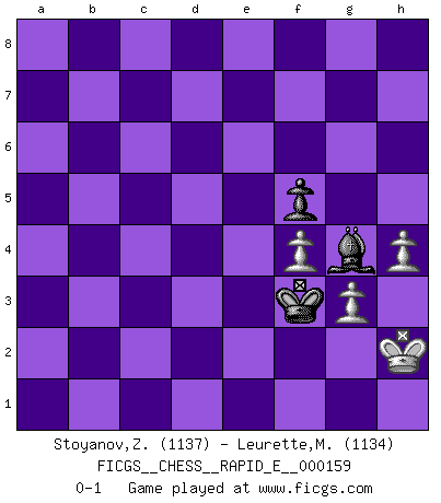 Last move : 0-1 2015 November 26 22:6:21 [Event "FICGS__CHESS__RAPID_E__000159"] [Site "FICGS"] [Date "2015.09.24"] [Round "1"] [White "Stoyanov,Zdravko"] [Black "Leurette,Marc-Antoine"] [Result "0-1"] [WhiteElo "1137"] [BlackElo "1134"] 1.e4 e5 2.Nf3 Nc6 3.Bb5 a6 4.Bxc6 dxc6 5.h3 Nf6 6.d3 h6 7.a3 c5 8.Be3 Bd6 9.c4 O-O 10.O-O c6 11.Nbd2 b5 12.Re1 a5 13.b3 b4 14.axb4 cxb4 15.d4 exd4 16.Nxd4 c5 17.Nb5 Be5 18.Bxc5 Re8 19.Nf3 Bxa1 20.Qxa1 Bd7 21.Rd1 Rc8 22.Be3 Qe7 23.Nd6 Nxe4 24.Nxc8 Bxc8 25.Bd4 Nf6 26.Re1 Qd8 27.Bxf6 gxf6 28.Rxe8+ Qxe8 29.Qxf6 Kh7 30.Qh4 Qg8 31.Ne5 Be6 32.Qe4+ Kh8 33.Qe3 Qg5 34.Nf3 Qg7 35.Ne5 Qf6 36.f4 h5 37.Qf3 h4 38.Nc6 a4 39.bxa4 Bxc4 40.Nxb4 Qb6+ 41.Kh2 Qxb4 42.Qh5+ Kg7 43.Qxh4 Qxa4 44.Qg4+ Kf8 45.Qc8+ Kg7 46.Qg4+ Kf6 47.Qg5+ Ke6 48.Qe5+ Kd7 49.Qd4+ Kc6 50.Qe4+ Kc7 51.Qe5+ Kb6 52.Qd6+ Kb5 53.Qd7+ Kb4 54.Qxa4+ Kxa4 55.h4 Be2 56.Kh3 f5 57.g3 Bg4+ 58.Kg2 Kb4 59.Kf2 Kc4 60.Ke3 Kc3 61.Kf2 Kd3 62.Kg1 Ke3 63.Kg2 Bh5 64.Kg1 Kf3 65.Kh2 Bg4 0-1 Ruy Lopez : Exchange variation Kingside Castling by player Black (move 9) Kingside Castling by player White (move 10) 10 pieces endgame at move 43 : White KQPPPP , Black KQBP WHITE : King + 1 Queen 4 Pawns BLACK : King + 1 Queen 1 Bishop 1 Pawn 9 pieces endgame at move 43 : White KQPPP , Black KQBP WHITE : King + 1 Queen 3 Pawns BLACK : King + 1 Queen 1 Bishop 1 Pawn 8 pieces endgame at move 54 : White KQPPP , Black KBP WHITE : King + 1 Queen 3 Pawns BLACK : King + 1 Bishop 1 Pawn 7 pieces endgame at move 54 : White KPPP , Black KBP WHITE : King + 3 Pawns BLACK : King + 1 Bishop 1 Pawn Player Black won this chess game. Follow this game move after move (download)Live, lose, and learn, by observing your opponent how to win. (Amber Steenbock) Alle offensichtlichen Züge sehen nach dem Spiel in der Analyse verdächtig aus. (Viktor Kortschnoi) Los libros de Ajedrez deben de usarse igual como usamos los anteojos: para mejorar la vista, aunque algunos jugadores los quieren usar como si ellos les otorgaran la vision. (José Raúl Capablanca) Vous n'êtes pas toujours obligé de jouer le meilleur coup. Un coup doit être actif, entreprenant, correct et beau ! (David Bronstein) Happy endings are just stories that haven't finished yet. (Jane Smith in Mr & Mrs Smith)