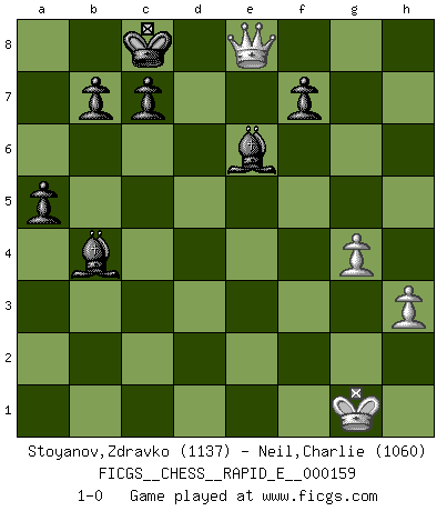 Last move : 1-0 2015 October 31 14:28:50 [Event "FICGS__CHESS__RAPID_E__000159"] [Site "FICGS"] [Date "2015.09.24"] [Round "1"] [White "Stoyanov,Zdravko"] [Black "Neil,Charlie"] [Result "1-0"] [WhiteElo "1137"] [BlackElo "1060"] 1.e4 e5 2.Nf3 Nc6 3.Bb5 a6 4.Bxc6 dxc6 5.h3 Bd6 6.O-O Nf6 7.d3 h6 8.a3 Be6 9.Be3 Qd7 10.Nbd2 O-O-O 11.c4 g5 12.Re1 c5 13.b4 cxb4 14.axb4 Bxb4 15.Rb1 a5 16.Nxe5 Qd6 17.Nef3 Qxd3 18.Rb3 Nxe4 19.Rxd3 Rxd3 20.Qc2 Rhd8 21.g4 Nxd2 22.Nxd2 Bxd2 23.Rd1 Bxe3 24.Rxd3 Rxd3 25.Qxd3 Bc5 26.Qh7 Bxc4 27.Qxh6 Be7 28.f4 gxf4 29.Qxf4 Be6 30.Qa4 Bb4 31.Qe8+ 1-0 Ruy Lopez : Exchange variation Kingside Castling by player White (move 6) Queenside Castling by player Black (move 10) Player White won this chess game. Follow this game move after move (download)Capture of the adverse King is the ultimate but not the first object of the game. (William Steinitz) Moralische Siege zählen nicht. (Savielly Grigorievitsch Tartakower) El ganador de una partida es aquel jugador que hace el penúltimo error. (Savielly Tartakover) Nous vivons dans un monde échiquéen : chaque jour qui passe est un défi à relever. (Philosophe Sasha) Difficult things take a long time, impossible things a little longer. (Author unknown)