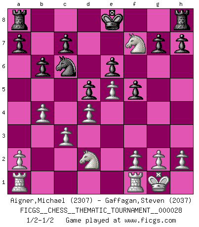 Last move : 1/2-1/2 2007 June 15 7:59:32 [Event "FICGS__CHESS__THEMATIC_TOURNAMENT__000028"] [Site "FICGS"] [Date "2007.03.11"] [Round "1"] [White "Aigner,Michael"] [Black "Gaffagan,Steven"] [Result "1/2-1/2"] [WhiteElo "2307"] [BlackElo "2037"] 1.e4 e6 2.d4 f5 3.e5 d5 4.Nh3 b6 5.Bg5 Qd7 6.Be2 Bb4+ 7.c3 Be7 8.Nd2 Ba6 9.O-O Bxe2 10.Qxe2 Nc6 11.b4 Bxg5 12.Nxg5 Nh6 13.Qh5+ Nf7 14.Qxf7+ Qxf7 15.Nxf7 1/2-1/2 French defense Kingside Castling by player White (move 9) This chess game ended in a draw. Follow this game move after move (download)You are for me the Queen on d8 and I am the Pawn on d7 !! (Eduard Gufeld) Kombinieren und Schwarzhandel gehören verboten. (Savielly Grigorievitsch Tartakower) Una compensación adecuada por un sacrificio es tener una combinación sólida que conduce a una posición ganadora; una compensación adecuada por una metida de pata es dejar a tu oponente arrebatar una derrota de las fauces de la victoria. (Bruce A. Moon) Si rien de grave n'est détecté lors de l'analyse d'une position, on joue alors le coup. Seconde règle de Blumenfeld. Convictions are more dangerous enemies of truth than lies. (Friedrich Nietzsche)