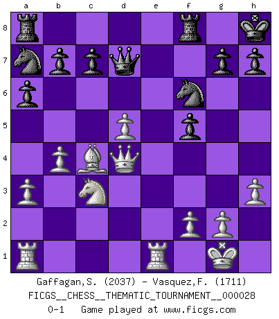 Last move : 0-1 2007 September 18 2:49:28 [Event "FICGS__CHESS__THEMATIC_TOURNAMENT__000028"] [Site "FICGS"] [Date "2007.03.11"] [Round "1"] [White "Gaffagan,Steven"] [Black "Vasquez,Fernando"] [Result "0-1"] [WhiteElo "2037"] [BlackElo "1711"] 1.e4 e6 2.d4 f5 3.exf5 exf5 4.Bd3 d5 5.Nf3 Nf6 6.O-O Nc6 7.Re1+ Be7 8.c4 O-O 9.Nc3 Nb4 10.Bf1 Kh8 11.a3 Nc6 12.b4 a6 13.Bf4 dxc4 14.d5 Na7 15.Bxc4 Bd6 16.Be5 Bd7 17.Qd4 Bxe5 18.Nxe5 Ng4 19.Nxd7 Qxd7 20.h3 Nf6 0-1 This chess game has been lost on time (started : 2007.03.11 22:59:25) French defense Kingside Castling by player White (move 6) Kingside Castling by player Black (move 8) Player Black won this chess game. Follow this game move after move (download)The game of chess is the touchstone of the intellect. (Goethe) Ein Gewinn durch eine ungenaue Kombination, sei sie auch noch so vorzeigbar, erfüllt mich mit Schaudern. (Wilhelm Steinitz) Evita las multitudes. Haz independientemente tu propio razonamiento. Trata de ser el jugador de Ajedrez, no la pieza de Ajedrez. (Ralph Charell) Le jeu d'échecs fait naître et fortifie en nous plusieurs qualités précieuses dans le cours de l'existence, telles que la prévoyance, la circonspection, la prudence, et la persévérance. (Benjamin Franklin - 1783, la morale des échecs) I can't decide which is riskier; taking crazy risks, or taking advice on crazy risks from a crazy risk taker. (Gregory House in House M.D.)