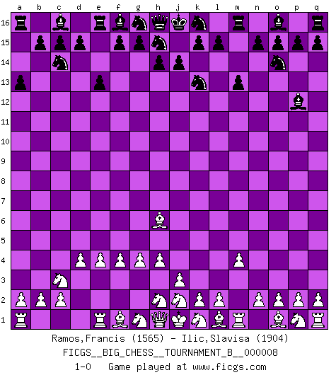 Last move : 1-0 2015 November 11 6:23:45 [Event "FICGS__BIG_CHESS__TOURNAMENT_B__000008"] [Site "FICGS"] [Date "2015.09.24"] [Round "1"] [White "Ramos,Francis"] [Black "Ilic,Slavisa"] [Result "1-0"] [WhiteElo "1565"] [BlackElo "1904"] 1.g2-g4 j15-k13 2.e2-e4 e15-e13 3.d2-d4 m15-m13 4.c1-h6 b16-c14 5.b1-c3 p16-o14 6.f2-f4 l16-p12 7.h3-h4 a15-a13 8.m2-m4 1-0 This big chess game has been lost on time (started : 2015.09.24 16:46:35) Follow this game move after move (download)The enormous mental resilience, without which no Chess player can exist, was so much taken up by Chess that he could never free his mind of this game. (Albert Einstein) Das Schach ist nichts für kleine Geister, es beansprucht einen vollen Mann, der sich nicht sklavisch an das Überlieferte hält, sondern selbständig die Tiefen des Spiels zu ergründen sucht. (Wilhelm Steinitz) Realmente no sabemos como el juego fue inventado, aunque hay sospechas. Tan pronto como descubramos a los culpables, se los haremos saber. (Bruce Pandolfini) Lorsque vous vous retrouvez devant une position atroce, ne tendez pas un ultime piège dérisoire avec l'intention d'abandonner si l'adversaire le déjoue ! Faites-vous plutôt un devoir de résister comme si votre vie en dépendait. Jouez le coup qui vous déplairait au centuple si vous étiez dans la peau de votre tortionnaire ! Is not life a hundred times too short to bore ourselves ? (Friedrich Nietzsche)