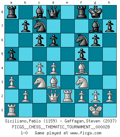 Last move : 1-0 2007 July 19 5:38:44 [Event "FICGS__CHESS__THEMATIC_TOURNAMENT__000028"] [Site "FICGS"] [Date "2007.03.11"] [Round "1"] [White "Siciliano,Pablo"] [Black "Gaffagan,Steven"] [Result "1-0"] [WhiteElo "1159"] [BlackElo "2037"] 1.e4 e6 2.d4 f5 3.exf5 exf5 4.Nf3 Nf6 5.c4 g6 6.Nc3 Bg7 7.Bd3 O-O 8.O-O d6 9.Re1 c6 10.Bf4 Na6 11.a3 Nc7 12.Qd2 a5 13.Re2 1-0 This chess game has been lost on time (started : 2007.03.11 22:59:25) French defense Kingside Castling by player Black (move 7) Kingside Castling by player White (move 8) Player White won this chess game. Follow this game move after move (download)When I asked Fischer why he had not played a certain move in our game, he replied: 'Well, you laughed when I wrote it down !' (Mikhail Tal) Im Leben werden Partien nie so unstrittig gewonnen wie im Spiel (Emanuel Lasker) Por esta medida (el intervalo entre Fischer y sus contemporaneos), yo le considero el mas grande campeón mundial. (Garry Kasparov) J'ai vu le vaincu d'Echecs jouer des années durant dans l'espoir de la fête de la victoire. Car tu es plus riche de ce qu'elle existe si même elle n'est point pour toi. Ainsi de la perle du fond des mers. (Antoine de Saint-Exupéry) There is a computer disease that anybody who works with computers knows about. It's a very serious disease and it interferes completely with the work. The trouble with computers is that you 'play' with them ! (Richard P. Feynman)
