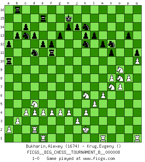 Last move : 1-0 2016 July 3 0:40:5 [Event "FICGS__BIG_CHESS__TOURNAMENT_B__000008"] [Site "FICGS"] [Date "2015.09.24"] [Round "1"] [White "Bukharin,Alexey"] [Black "Krug,Evgeny"] [Result "1-0"] [WhiteElo "1674"] [BlackElo ""] 1.j2-k4 j15-k13 2.h1-o7 h15-g13 3.o7-o15 p16-o14 4.o15-f7 k16-h15 5.e2-e4 m15-m13 6.m2-m4 h16-o10 7.n2-n4 d15-d14 8.p1-o3 f15-f13 9.b1-c3 g16-f14 10.d2-d4 e15-e13 11.c1-e3 f13-f12 12.g2-g4 n15-n13 13.h3-h4 b16-d15 14.f1-l6 l16-n14 15.g1-h3 o10-o13 16.f2-f3 o16-m14 17.o1-h7 o13-o11 18.l2-l4 c15-c14 19.k1-l3 a16-b16 20.l1-p5 l15-l14 21.a1-d1 q16-n16 22.h2-j4 d15-c13 23.j4-l5 m13-m12 24.f7-h5 o11-h5 25.k4-h5 a15-a14 26.h3-j5 c16-f13 27.l3-k5 e13-e12 28.k2-k4 l14-l13 29.m4-m5 f16-e15 30.o3-m4 n16-o16 31.m4-n6 f14-h13 32.o2-o4 g13-e14 33.p5-e15 e16-e15 34.o4-o5 d14-d13 35.p2-p4 g15-g13 36.p4-p5 f13-j10 37.q2-q4 p15-p14 38.q4-q5 j16-j15 39.q5-q6 h15-f14 40.p5-p6 b15-b13 41.j1-k2 h13-k12 42.p6-p7 m14-l15 43.q6-q7 o14-m15 44.n6-o8 k13-l11 45.l5-n6 l15-g11 46.k5-l7 f14-h13 47.q7-q8 n14-o13 48.h7-o13 o16-o13 49.l6-j8 o13-o15 50.q8-q9 a14-a13 51.j5-l6 a13-a12 52.l6-k8 j10-n14 53.m5-m6 m16-o16 54.k8-m9 l11-m9 55.l7-m9 c13-d11 56.q9-q10 n14-o13 57.j8-o13 o15-o13 58.e3-k8 g11-k8 59.m9-k8 k15-k13 60.n4-n5 e14-c13 61.o5-o6 o13-o10 62.k8-m9 o10-b10 63.b2-b3 b10-c10 64.d1-d3 o16-o11 65.p7-p8 c10-l10 66.l4-l5 m15-o14 67.n6-m8 l10-f10 68.c3-d5 o11-f11 69.f3-f4 n13-n12 70.m8-o9 f10-h10 71.c2-c4 q15-q13 72.h5-k6 h10-a10 73.d3-d2 p14-p13 74.n5-n6 q13-q12 75.n6-n7 n12-n11 76.o9-p7 q12-q11 77.n7-n8 j15-h15 78.m9-n7 h13-k14 79.p7-o9 o14-n12 80.o6-o7 1-0 This big chess game has been lost on time (started : 2015.09.24 16:46:35) Follow this game move after move (download)Pawn endings are to Chess what putting is to golf. (Cecil Purdy) Ohne Fehler kann es keine Brillanz geben. (Emanuel Lasker) El Ajedrez es despiadado: debes de estar preparado para matar gente. (Nigel Short) Des combinaisons [dans le jeu d'échecs] pareilles à des mélodies. Je crois entendre pour ainsi dire la musique des coups... (Vladimir Nabokov) Lottery : A tax on people who are bad at math. (Author unknown)