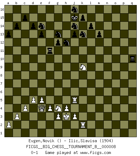 Last move : 0-1 2016 September 29 21:58:8 [Event "FICGS__BIG_CHESS__TOURNAMENT_B__000008"] [Site "FICGS"] [Date "2015.09.24"] [Round "1"] [White "Evgen,Novik"] [Black "Ilic,Slavisa"] [Result "0-1"] [WhiteElo ""] [BlackElo "1904"] 1.f2-f4 j15-k13 2.g2-g3 b16-c14 3.j2-h4 e15-e13 4.n2-n4 m15-m13 5.m2-m4 p16-o14 6.c2-c4 l16-p12 7.l1-n3 n15-n14 8.d2-d3 f16-b12 9.l2-l3 d15-d14 10.e2-e4 c16-l8 11.f1-e2 l8-e2 12.g1-e2 e16-e14 13.o1-c12 e14-f14 14.n3-p5 f14-f12 15.c12-a10 h16-o10 16.a10-g4 p12-g4 17.h2-g4 o10-o2 18.k1-m2 o2-p2 19.p1-o3 o16-f8 20.q2-q3 p2-p3 21.n4-n5 f12-k12 22.h1-l4 k12-l12 23.l4-n2 f8-l3 24.m1-p1 l3-k2 25.j1-k2 b12-l3 26.k2-j2 p3-p1 27.q1-p1 m16-m14 28.p1-l1 m14-l14 29.p5-n7 q16-m16 30.n2-m3 a16-e16 31.n7-l5 l3-b12 32.m2-k3 e16-e14 33.m3-p6 e14-g14 34.p6-p15 o14-n12 35.p15-o15 g14-g11 36.o15-q15 g11-p11 37.l1-p1 p11-o11 38.e1-o1 m16-o16 39.q15-q5 n14-n13 40.q5-f15 g16-e15 41.o3-m2 o11-o2 42.o1-o2 o16-o2 43.h4-j6 l14-q14 44.j6-k4 q14-q3 45.c1-e3 n12-l11 46.b1-c3 l12-q12 47.a1-o1 o2-n2 48.f15-g15 h15-g13 49.g15-f16 j16-j15 50.p1-p16 g13-h15 51.f16-f15 q3-n3 52.o1-o16 j15-k14 53.e3-b6 j14-j13 54.o16-o14 l15-l14 55.o14-o15 k13-l15 56.f15-k11 l11-k13 57.k11-p11 q12-q3 58.p11-n13 n3-k3 59.h3-h4 n2-m2 60.j2-h3 b12-k4 61.l5-k4 k3-k4 62.b6-e9 k4-m4 63.e9-m2 m4-m2 64.n13-n11 k14-j14 65.n11-h11 q3-q2 66.h11-d15 e15-d13 67.d15-g12 j14-k14 68.n5-n6 a15-a13 69.p16-p4 b15-b14 70.p4-n4 c14-e15 71.n6-n7 m2-m12 72.g12-n6 q2-q12 73.n7-n8 m12-d12 74.d3-d4 e15-g16 75.d4-d5 g16-f14 76.e2-d4 k16-j14 77.o15-o14 h15-g13 78.b2-b3 d12-g12 79.e4-e5 d13-f12 80.n4-n5 f12-e14 81.o14-o2 f14-h13 82.n8-n9 h13-g15 83.o2-n2 g12-l12 84.n6-o5 j14-l13 85.n9-n10 g15-j14 86.d4-f5 l12-g12 87.o5-o10 q12-o12 88.o10-q10 o12-q12 89.q10-k4 g12-f12 90.f5-h6 q12-k12 91.k4-n1 k12-h12 92.c3-e4 j14-k12 93.e4-f6 l15-j14 94.n2-n3 f12-a12 95.n3-n2 k12-j10 96.n1-m1 j10-l11 97.n10-n11 l11-n12 98.n5-k5 n12-m14 99.m1-o1 a12-a11 100.n2-k2 a11-n11 101.o1-o10 h12-h11 102.k5-h5 n11-o11 103.o10-q10 k14-j15 104.h6-g8 o11-q11 105.q10-c10 h11-c11 106.c10-g14 j14-h12 107.g14-l10 c11-l11 108.l10-f5 m14-l12 109.g8-h10 l13-j14 110.f6-g8 l12-k14 111.g8-f10 q11-q10 112.f10-g12 k14-j16 113.h5-j5 h14-h13 114.h10-k9 l11-f11 115.f5-e4 h13-g12 0-1 Follow this game move after move (download)The most powerful weapon in Chess is to have the next move. (David Bronstein) Es tut gut, die Entwicklungsperiode von, [...] demokratischem Geist durchdringen zu lassen. Wie undemokratisch wäre es doch beispielsweise, den einen Offizier große Spaziertouren vornehmen zu lassen, während die anderen zu Hause säßen und sich entsetzlich langweilten. (Aaron Nimzowitsch) Yo no creo en la psicología. Yo creo en las buenas movidas. (Bobby Fischer) Que feriez-vous si vous étiez en train de jouer aux échecs et que la fin du monde arrive ? Je continuerais à jouer. (Saint Borromée) The obstacle is the path. (Zen proverb)