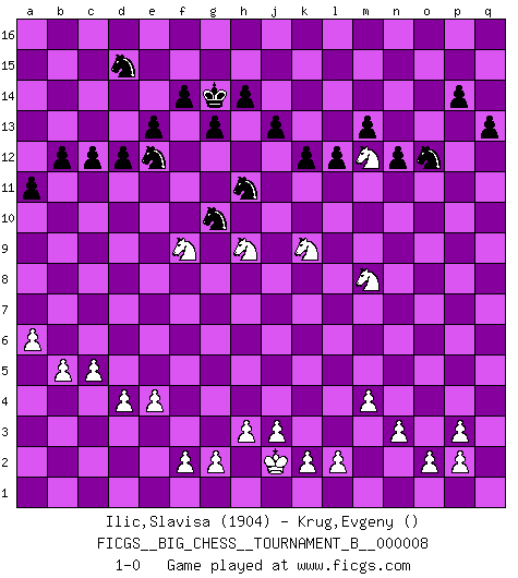 Last move : 1-0 2016 July 2 0:29:23 [Event "FICGS__BIG_CHESS__TOURNAMENT_B__000008"] [Site "FICGS"] [Date "2015.09.24"] [Round "1"] [White "Ilic,Slavisa"] [Black "Krug,Evgeny"] [Result "1-0"] [WhiteElo "1904"] [BlackElo ""] 1.j2-k4 j15-k13 2.h1-o7 h15-g13 3.o7-o15 p16-o14 4.o15-b3 b15-b14 5.m2-m4 c16-b15 6.p1-o3 n15-n14 7.e2-e4 k16-h15 8.l1-p5 e15-e14 9.n2-n3 f15-f14 10.f1-c4 m15-m13 11.d2-d3 c15-c13 12.h2-g4 g16-j15 13.o1-g8 d15-d13 14.m1-m3 h15-j13 15.m3-l3 l15-l13 16.c1-l9 b16-d15 17.k1-h2 f16-d14 18.e1-e3 l13-l12 19.e3-f3 o16-h10 20.b1-c3 j15-h13 21.a1-e1 h16-l13 22.g1-j2 k15-k14 23.j2-h4 l16-m15 24.p5-q4 j16-j15 25.f3-f5 q16-o16 26.q4-p3 m15-n16 27.k4-j6 n16-p14 28.f5-k5 h10-p3 29.q2-p3 n14-n13 30.j1-j2 o16-o15 31.c4-e6 m16-o16 32.q1-q4 e16-n16 33.e1-q1 d14-c15 34.l9-o6 a15-a14 35.o6-q8 l13-m14 36.h2-k3 k13-m12 37.e6-f5 p14-f5 38.h4-f5 j15-h15 39.q4-p4 p15-p14 40.l3-l6 d13-d12 41.l6-o6 o14-q13 42.k5-o5 o15-o6 43.o5-o6 o16-o6 44.q8-o6 n16-o16 45.o6-l9 o16-o15 46.g8-h9 b15-h9 47.b3-h9 a16-a15 48.c3-d5 m14-h10 49.h9-h10 c15-h10 50.q1-q7 j13-k11 51.l9-k8 h10-k8 52.j6-k8 b14-b13 53.p4-o4 o15-o13 54.k3-l5 h13-k12 55.a2-a4 a15-a16 56.o3-n5 a16-o16 57.q7-o7 o13-o7 58.o4-o7 o16-o7 59.n5-o7 j14-j13 60.b2-b4 m12-l10 61.l5-m7 l10-k8 62.m7-k8 q13-o12 63.f5-g7 e14-e13 64.g4-h6 q15-q13 65.c2-c4 n13-n12 66.a4-a5 a14-a13 67.d5-e7 k11-h12 68.b4-b5 a13-a12 69.d3-d4 h12-g10 70.c4-c5 b13-b12 71.a5-a6 a12-a11 72.e7-f9 g13-e12 73.h6-g8 c13-c12 74.g8-h10 k14-k13 75.g7-h9 k12-h11 76.o7-m8 g15-g13 77.h10-k9 h15-g14 78.k8-l10 k13-k12 79.l10-m12 1-0 This big chess game has been lost on time (started : 2015.09.24 16:46:35) Follow this game move after move (download)Chess is mental torture. (Garry Kasparov) Wer mein Gambit spielt, muß bereit sein, alle Brücken hinter sich abzubrechen. Es verändert den ganzen Menschen. Es wirkt wie ein Zauberstab und fördert verkümmerte, gute Charakter- eigenschaften wieder zu Tage. (Emil Joseph Diemer) A la fecha, Fischer esta simplemente un nivel arriba de todos los mejores jugadores de Ajedrez del mundo. (John Jacobs) Aux échecs, les retours au sommet sont rares : les dommages psychologiques consécutifs à une défaite sont trop sévères. (Daily Telegraph) Live, lose, and learn, by observing your opponent how to win. (Amber Steenbock)