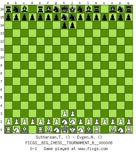 Last move : 0-1 2015 October 25 2:50:21 [Event "FICGS__BIG_CHESS__TOURNAMENT_B__000008"] [Site "FICGS"] [Date "2015.09.24"] [Round "1"] [White "Sutharsan,Thirunathan"] [Black "Evgen,Novik"] [Result "0-1"] [WhiteElo ""] [BlackElo ""] 0-1 This big chess game has been lost on time (started : 2015.09.24 16:46:35) Follow this game move after move (download)An attack on the wing should be met by play in the center. (Nimzovitch) Frage: Wie viele Autos haben Sie schon zerstört? - Antwort: Nur zwei. (Loek van Wely) De todos mis libros Rusos, la defensa contiene y difunde el 'calor' mas grande que pudiese verse extraño al observar lo supremamente abstracto que el Ajedrez supuestamente es. (Vladimir Nabokov) Il a essayé de se convaincre qu'il pourrait empêcher toutes les erreurs et ne jamais perdre. L'horreur ! Gary Kasparov au sujet de Robert Fischer. Every vice is only an exaggeration of a necessary and virtuous function. (Ralph Waldo Emerson, Journals 1936)