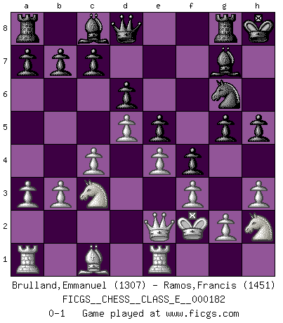 Last move : 0-1 2015 December 18 18:7:56 [Event "FICGS__CHESS__CLASS_E__000182"] [Site "FICGS"] [Date "2015.09.26"] [Round "1"] [White "Brulland,Emmanuel"] [Black "Ramos,Francis"] [Result "0-1"] [WhiteElo "1307"] [BlackElo "1451"] 1.c4 Nf6 2.d4 g6 3.Nc3 Bg7 4.e4 d6 5.h3 O-O 6.Nf3 Nc6 7.a3 e5 8.d5 Ne7 9.Bd3 Nd7 10.O-O f5 11.Re1 f4 12.Ng5 Nc5 13.Nf3 Nxd3 14.Qxd3 h6 15.Nh2 g5 16.f3 h5 17.Qe2 Kh8 18.b3 Rg8 19.Kf2 Ng6 0-1 English, 1...Nf6 (Anglo-Indian defense) Kingside Castling by player Black (move 5) Kingside Castling by player White (move 10) Player Black won this chess game. Follow this game move after move (download)Bobby Fischer is the greatest Chess player who has ever lived. (Ken Smith) Im Internet Chess Club betrug mein Rating vorübergehend 3350 ELO-Punkte. (Sergej Karjakin) De eso se trata el Ajedrez. Un día le das una lección a tu oponente y al día siguiente el te da una a tí. (Bobby Fischer) Lorsque vous vous retrouvez devant une position atroce, ne tendez pas un ultime piège dérisoire avec l'intention d'abandonner si l'adversaire le déjoue ! Faites-vous plutôt un devoir de résister comme si votre vie en dépendait. Jouez le coup qui vous déplairait au centuple si vous étiez dans la peau de votre tortionnaire ! Everything in life is luck. (Donald Trump)
