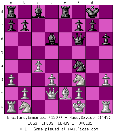 Last move : 0-1 2016 January 24 17:4:36 [Event "FICGS__CHESS__CLASS_E__000182"] [Site "FICGS"] [Date "2015.09.26"] [Round "1"] [White "Brulland,Emmanuel"] [Black "Nudo,Davide"] [Result "0-1"] [WhiteElo "1307"] [BlackElo "1449"] 1.c4 e6 2.a3 c5 3.Nc3 d5 4.e3 d4 5.exd4 cxd4 6.Nb1 e5 7.d3 Nf6 8.h3 Nbd7 9.Bg5 h6 10.Bxf6 Nxf6 11.Nf3 Bd6 12.Be2 Nh5 13.Nxe5 Nf4 14.Nf3 Nxg2+ 15.Kf1 Nf4 16.Qd2 O-O 17.Nxd4 Qf6 18.Nf3 Re8 0-1 This chess game has been lost on time (started : 2015.09.26 3:28:7) English Opening Kingside Castling by player Black (move 16) Player Black won this chess game. Follow this game move after move (download)Chess is 99 percent tactics. (Teichmann) Man kann eine Schachpartie nur gewinnen, wenn das Gleichgewicht gestört ist. In einer Stellung mit ungestörtem Gleichgewicht ist auch das größte Genie hilflos - in der Stellung steckt dann eben kein genialer Einfall. (Wilhelm Steinitz) Yo siempre he tenido un ligero sentimiento de lástima por una persona que no tiene conocimiento del Ajedrez. (Siegbert Tarrasch) Avec des compensations pour le matériel en plus... (Anonyme) If you don't practice you don't deserve to win. (Andre Agassi)