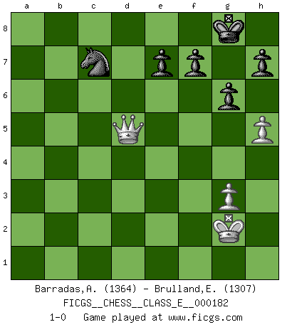 Last move : 1-0 2016 March 11 6:20:0 [Event "FICGS__CHESS__CLASS_E__000182"] [Site "FICGS"] [Date "2015.09.26"] [Round "1"] [White "Barradas,Anderson"] [Black "Brulland,Emmanuel"] [Result "1-0"] [WhiteElo "1364"] [BlackElo "1307"] 1.e4 c5 2.Nf3 d6 3.d4 Nc6 4.Bb5 a6 5.Ba4 b5 6.Bb3 c4 7.d5 Nb8 8.Bxc4 bxc4 9.Nc3 g6 10.O-O Bg7 11.Bd2 Bg4 12.h3 Bxf3 13.Qxf3 Nf6 14.Be3 O-O 15.Rfd1 Nbd7 16.Bd4 Rb8 17.b3 cxb3 18.axb3 Ra8 19.Ne2 Ne5 20.Bxe5 dxe5 21.c4 Qd6 22.g3 Rfb8 23.Rdb1 Rb6 24.Qe3 Qb8 25.f4 exf4 26.Nxf4 Ra7 27.c5 Rb4 28.Ra3 a5 29.e5 Ne8 30.Nd3 Rb5 31.b4 axb4 32.Rxa7 Qxa7 33.Rxb4 Rxb4 34.Nxb4 Bxe5 35.Qxe5 Qxc5+ 36.Kg2 Qxb4 37.h4 Qd6 38.Qd4 Nc7 39.h5 Qxd5+ 40.Qxd5 1-0 This chess game has been lost on time (started : 2015.09.26 3:28:7) Sicilian Kingside Castling by player White (move 10) Kingside Castling by player Black (move 14) 10 pieces endgame at move 40 : White KQPP , Black KNPPPP WHITE : King + 1 Queen 2 Pawns BLACK : King + 1 Knight 4 Pawns Player White won this chess game. Follow this game move after move (download)All Chess players should have a hobby. (Savielly Tartakower) Wenn sie aufgeben, dann danke ich Ihnen für das Spiel (Eventualzug beim Fernschach). (Anonymous) ¿Porque tengo que perder ante este idiota?. (Aron Nimzovich) Votre seul travail dans les ouvertures est d'obtenir un milieu de partie jouable. (Lajos Portish) Establishing goals is all right if you don't let them deprive you of interesting detours. (Doug Larson)