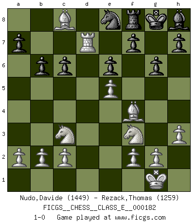 Last move : 1-0 2015 October 17 13:56:25 [Event "FICGS__CHESS__CLASS_E__000182"] [Site "FICGS"] [Date "2015.09.26"] [Round "1"] [White "Nudo,Davide"] [Black "Rezack,Thomas"] [Result "1-0"] [WhiteElo "1449"] [BlackElo "1259"] 1.e4 d6 2.d4 Nf6 3.Nc3 g6 4.Nf3 Bg7 5.Be2 Bd7 6.h3 O-O 7.e5 dxe5 8.dxe5 Ne8 9.O-O Nc6 10.Bf4 e6 11.Qd2 Ne7 12.Rad1 Nc6 13.Qxd7 Qxd7 14.Rxd7 Rd8 15.Rxd8 Nxd8 16.Rd1 Nc6 17.Bb5 Ne7 18.Rd8 c6 19.Rd7 Nc8 20.Be2 b6 21.Ba6 Bh8 22.Bxc8 1-0 Pirc : Classical system, 5.Be2 Kingside Castling by player Black (move 6) Kingside Castling by player White (move 9) Player White won this chess game. Follow this game move after move (download)Chess is ruthless: you've got to be prepared to kill people. (Nigel Short) Kann Schach nicht schließlich das Nationalspiel der Deutschen werden? Und welche weiteren Ausblicke bieten sich dann dar! Welche Hebung des allgemeinen Kultur-Niveaus, ja der Moral, wenn das Schachbrett den Kartentisch verdrängen würde! Wahrlich, ein Ziel, des Schweißes der Edlen wert! (Siegbert Tarrasch) El Ajedrez era la lengua materna de Capablanca. (Reti) Le moment que je préfère le plus dans une rencontre, c'est celui où je sens que la personnalité de l'adversaire se brise. (Robert Fischer) It's only after you lost everything, Tyler says, that you're free to do anything. (Chuck Palahniuk, Fight Club)