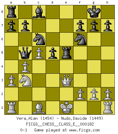 Last move : 0-1 2015 October 8 6:57:1 [Event "FICGS__CHESS__CLASS_E__000182"] [Site "FICGS"] [Date "2015.09.26"] [Round "1"] [White "Vera,Alan"] [Black "Nudo,Davide"] [Result "0-1"] [WhiteElo "1454"] [BlackElo "1449"] 1.d4 Nf6 2.c4 e6 3.Nc3 Bb4 4.e3 O-O 5.Qb3 c5 6.a3 Bxc3+ 7.Qxc3 cxd4 8.exd4 Nc6 9.Nf3 d5 10.c5 Re8 11.Bb5 Ne4 12.Qe3 Qa5+ 13.b4 Qxb5 14.Nd2 Nf6 15.Nb3 e5 16.dxe5 Rxe5 0-1 Nimzo-Indian : 4.e3 O-O Kingside Castling by player Black (move 4) Player Black won this chess game. Follow this game move after move (download)In a gambit you give up a Pawn for the sake of getting a lost game. (Samuel Standige Boden) Ich trinke, ich rauche, ich spiele, ich liebe Frauen aber Fernschach ist ein Laster, das ich nicht habe. (Mikhail Nekhemyevich Tal) Para mi, el Ajedrez es la vida y cada partida es como una nueva vida. Todo jugador de Ajedrez suele vivir muchas vidas durante su vida. (Eduard Gufeld) Des points faibles ou des trous dans la position de l'adversaire doivent être occupés par des pièces et non pas par des pions. (Siegbert Tarrasch) The leaves of memory seemed to make a mournful rustling in the dark. (Henry Wadsworth Longfellow)