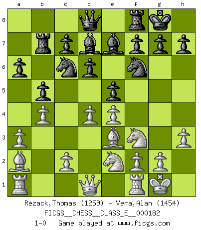 Last move : 1-0 2015 December 31 10:23:15 [Event "FICGS__CHESS__CLASS_E__000182"] [Site "FICGS"] [Date "2015.09.26"] [Round "1"] [White "Rezack,Thomas"] [Black "Vera,Alan"] [Result "1-0"] [WhiteElo "1259"] [BlackElo "1454"] 1.e4 e5 2.Nf3 Nc6 3.Nc3 Nf6 4.Bb5 d6 5.h3 Bd7 6.a3 Be7 7.O-O O-O 8.d4 a6 9.Ba4 b5 10.Bb3 Na5 11.Ba2 Rb8 12.b4 Nc6 13.Be3 Rb7 14.Ne2 1-0 This chess game has been lost on time (started : 2015.09.26 3:28:7) Four knights : Spanish variation Kingside Castling by player White (move 7) Kingside Castling by player Black (move 7) Player White won this chess game. Follow this game move after move (download)A chess genius has died; a loss for humanity. (Viktor Kortchnoi, about Bobby Fischer's death) Aljechin war kein Nazi. Er war ein Opportunist. Ein schrecklicher Mann. Er liebte Geld über alles und würde für Geld ein Jude, ein Katolik oder ein Protestant werden. (Miguel Najdorf) El Ajedrez es 99 por ciento táctica. (Teichmann) Toutes les manuvres exécutées sur une colonne ouverte ont pour but ultime l'intrusion définitive sur la septième ou la huitième rangée, en plein cur de la position ennemie. (Aaron Nimzovitch) The greatest con, that he ever pulled... was making you believe... that he is you. (Revolver, movie)