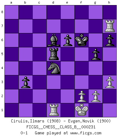 Last move : 0-1 2016 April 10 20:34:32 [Event "FICGS__CHESS__CLASS_B__000231"] [Site "FICGS"] [Date "2015.09.30"] [Round "1"] [White "Cirulis,Ilmars"] [Black "Evgen,Novik"] [Result "0-1"] [WhiteElo "1908"] [BlackElo "1900"] 1.b4 e6 2.a3 c5 3.bxc5 Bxc5 4.d4 Be7 5.e4 Nc6 6.Nf3 Nf6 7.Bd3 d5 8.e5 Ne4 9.O-O f5 10.exf6 Bxf6 11.c3 O-O 12.Qb3 Qa5 13.a4 h6 14.Be3 Rf7 15.Qb5 Nd6 16.Qxa5 Nxa5 17.Nbd2 Nc6 18.Bf4 Be7 19.Be5 Nf5 20.h3 Bd7 21.Bh2 R7f8 22.a5 Rac8 23.Rfb1 Nd8 24.c4 dxc4 25.Nxc4 Bc6 26.Nfe5 Be8 27.a6 b5 28.Nb6 axb6 29.a7 Bc6 30.Bxf5 Rxf5 31.Nxc6 Nxc6 32.a8Q Rxa8 33.Rxa8+ Kf7 34.Ra6 Nxd4 35.Rxb6 Rd5 36.Kf1 b4 37.Rb7 Kf6 38.Bg3 g5 39.Rd1 Bc5 40.Bd6 Bxd6 41.Rh7 b3 0-1 Polish (Sokolsky) opening Kingside Castling by player White (move 9) Kingside Castling by player Black (move 11) Promotion Queen by player White (move 32) Player Black won this chess game. Follow this game move after move (download)When you don't know what to do, wait for your opponent to get an idea - it's sure to be wrong. (Tarrasch) Offensichtlich kennt Kasparow nichts anderes als Schach, und ich könnte 500 weitere Spieler dieser Sorte benennen. (Judith Polgar) El Ajedrez es una guerra en un tablero. El objetivo es aplastar la mente del oponente. (Bobby Fischer) Si je n'étais pas joueur d'échecs, je serais le meilleur dans quelque chose d'autre. (Anatoli Karpov) I think your argument is specious - I think your tie is ugly. (Gregory House to Dr. Foreman, House M.D.)