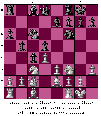 Last move : 0-1 2015 December 27 10:6:5 [Event "FICGS__CHESS__CLASS_B__000231"] [Site "FICGS"] [Date "2015.09.30"] [Round "1"] [White "Zatiek,Leandro"] [Black "Krug,Evgeny"] [Result "0-1"] [WhiteElo "1800"] [BlackElo "1900"] 1.d4 d5 2.c4 e6 3.Nf3 Be7 4.Nc3 Nf6 5.e3 O-O 6.Bd3 c5 7.cxd5 exd5 8.O-O c4 9.Be2 Nc6 10.h3 a6 11.Qc2 b5 0-1 Queen's gambit declined Kingside Castling by player Black (move 5) Kingside Castling by player White (move 8) Player Black won this chess game. Follow this game move after move (download)Adequate compensation for a sacrifice is having a sound combination leading to a winning position; adequate compensation for a blunder is having your opponent snatch defeat from the jaws of victory. (Bruce A. Moon) Schach ist gnadenlos. Du mußt bereit sein zu töten. (Nigel Short) La esencia del Ajedrez es pensar acerca de lo que el Ajedrez es. (David Bronstein) Tout change constamment, y compris dans le monde des Echecs. (Botvinnik) I can't decide which is riskier; taking crazy risks, or taking advice on crazy risks from a crazy risk taker. (Gregory House in House M.D.)
