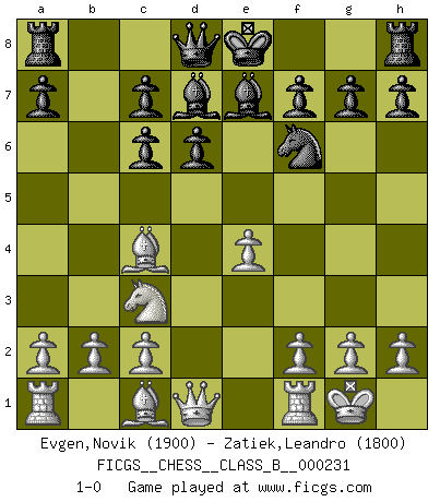 Last move : 1-0 2015 November 29 7:51:14 [Event "FICGS__CHESS__CLASS_B__000231"] [Site "FICGS"] [Date "2015.09.30"] [Round "1"] [White "Evgen,Novik"] [Black "Zatiek,Leandro"] [Result "1-0"] [WhiteElo "1900"] [BlackElo "1800"] 1.e4 e5 2.Nf3 Nc6 3.Bb5 d6 4.d4 exd4 5.Nxd4 Bd7 6.Nxc6 bxc6 7.Bc4 Nf6 8.Nc3 Be7 9.O-O 1-0 This chess game has been lost on time (started : 2015.09.30 0:41:37) Ruy Lopez : Old Steinitz defense Kingside Castling by player White (move 9) Player White won this chess game. Follow this game move after move (download)After a bad opening, there is hope for the middle game. After a bad middle game, there is hope for the endgame. But once you are in the endgame, the moment of truth has arrived. (Edmar Mednis) Zum Sieg gelangt man nicht, wenn man gut, sondern nur wenn man besser spielt (Savielly Grigorievitsch Tartakower) Aquel que ve no otra dirección en el juego que la de dar Jaque Mate a su oponente, nunca será un buen jugador de Ajedrez. (Euwe) La conception d'un plan est le processus par lequel un joueur exploite les avantages de sa position tout en s'efforçant d'en réduire au minimum les inconvénients. Afin de garantir le succès, un plan doit toujours se fonder sur un diagnostic objectif des particularités d'une position. La conception d'un plan est d'autant plus difficile que la position est équilibrée, et grandement facilitée lorsqu'il n'existe qu'un seul plan susceptible de répondre aux exigences de la position. (Harry Golombek) Those parts of the system that you can hit with a hammer (not advised) are called hardware; those program instructions that you can only curse at are called software. (Anonymous)