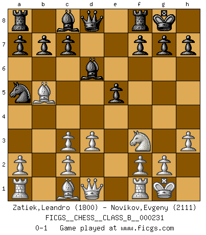 Last move : 0-1 2015 November 27 19:45:33 [Event "FICGS__CHESS__CLASS_B__000231"] [Site "FICGS"] [Date "2015.09.30"] [Round "1"] [White "Zatiek,Leandro"] [Black "Novikov,Evgeny"] [Result "0-1"] [WhiteElo "1800"] [BlackElo "2111"] 1.e4 e5 2.Nf3 Nf6 3.Nc3 Nc6 4.h3 d5 5.exd5 Nxd5 6.Bb5 Nxc3 7.bxc3 Bd6 8.O-O O-O 9.d3 Na5 0-1 This chess game has been lost on time (started : 2015.09.30 0:41:37) Petrov Three knights game Kingside Castling by player White (move 8) Kingside Castling by player Black (move 8) Player Black won this chess game. Follow this game move after move (download)Different people feel differently about resigning. (Bobby Fischer) Wie, soll nun auch die Opposition abgeschafft werden? Ja, es tut mir leid, Ihnen diesen Schmerz nicht ersparen zu können. (Aaron Nimzowitsch) Debes de llevar a tu oponente hacia un profundo y obscuro bosque donde 2+2=5, y el camino que conduce a la salida es suficientemente ancho para solamente uno. (Mikhail Tal) Des idées, des idées, j'en ai cent, j'en ai mille. Des bonnes, des mauvaises, applicables, irréalisables... Il suffit de faire le tri ! (Roos) Programming can only do so much before it becomes too much. (Don Groves)