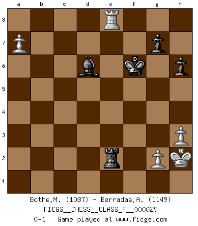 Last move : 0-1 2007 June 26 16:42:59 [Event "FICGS__CHESS__CLASS_F__000029"] [Site "FICGS"] [Date "2007.03.13"] [Round "1"] [White "Bothe,Matthias"] [Black "Barradas,Anderson"] [Result "0-1"] [WhiteElo "1087"] [BlackElo "1149"] 1.e4 e5 2.Nf3 Nf6 3.Nc3 Nc6 4.Bc4 d6 5.O-O Bg4 6.h3 Bxf3 7.Qxf3 Nd4 8.Qd3 a6 9.b3 Be7 10.Ba3 O-O 11.Nd5 b5 12.Nxf6+ Bxf6 13.Bd5 c6 14.Bxc6 Nxc6 15.Bxd6 Re8 16.Rfe1 Nd4 17.Bc5 Rc8 18.Bxd4 Qxd4 19.Qxd4 exd4 20.Rac1 h6 21.f4 d3 22.cxd3 Rxc1 23.Rxc1 Rd8 24.e5 Be7 25.Rc6 a5 26.Ra6 Bc5+ 27.Kh2 a4 28.bxa4 bxa4 29.Rxa4 Rxd3 30.f5 Bd4 31.Ra8+ Kh7 32.e6 fxe6 33.fxe6 Bc5 34.a4 Rxd2 35.a5 Re2 36.Re8 Kg6 37.a6 Kf6 38.e7 Bxe7 39.a7 Bd6+ 0-1 Petrov Three knights game Kingside Castling by player White (move 5) Kingside Castling by player Black (move 10) 10 pieces endgame at move 38 : White KRPPP , Black KRBPP WHITE : King + 1 Rook 3 Pawns BLACK : King + 1 Rook 1 Bishop 2 Pawns Player Black won this chess game. Follow this game move after move (download)I'm not afraid of Spassky. The world knows I'm the best. You don't need a match to prove it. (Bobby Fischer) Fischer: 'Remis!?' Uhlmann: 'Aber es muss doch dreimal Zugwiederholung sein!' Fischer: 'Sie nehmen das Remis an, wie ich es sage, sonst spiele ich weiter und werde Sie dann schlagen!' (Robert James Fischer) Bobby es el jugador de Ajedrez mas fino que este país jamás haya producido. Su memoria para las movidas, su brillantez en soñar combinaciones y su feróz determinación por la victoria son algo extraño. (John Collins) Les réformistes prétendent que les progrès de la théorie conduiront à la disparition des échecs, et qu'il faut, pour leur rendre vie, en remanier les règles. En réalité, qu'exprime cette affirmation? Le mépris de l'intuition, de l'imagination et de tous les autres éléments qui font des échecs un art. (Alexander Alekhine) The worth of a book is to be measured by what you can carry away from it. (James Bryce)