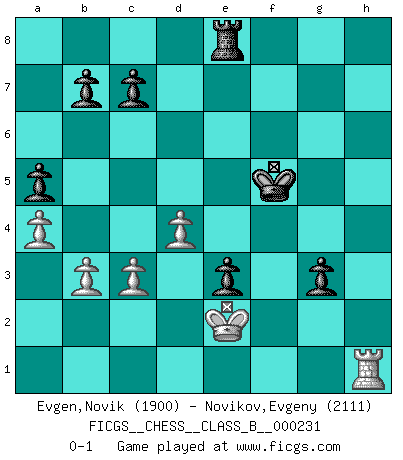 Last move : 0-1 2016 April 14 14:10:11 [Event "FICGS__CHESS__CLASS_B__000231"] [Site "FICGS"] [Date "2015.09.30"] [Round "1"] [White "Evgen,Novik"] [Black "Novikov,Evgeny"] [Result "0-1"] [WhiteElo "1900"] [BlackElo "2111"] 1.e4 e5 2.Nf3 Nf6 3.Nxe5 d6 4.Nf3 Nxe4 5.d4 d5 6.Bd3 Nc6 7.O-O Be7 8.Nc3 f5 9.Bf4 O-O 10.Ne5 Nxe5 11.Bxe5 Bf6 12.Bxf6 Rxf6 13.Ne2 Qd6 14.f3 Rh6 15.h3 Bd7 16.fxe4 fxe4 17.Bxe4 dxe4 18.c3 Bxh3 19.gxh3 Rxh3 20.Nf4 Rh4 21.Qb3+ Kh8 22.Qf7 g5 23.Rae1 gxf4 24.Rxe4 Rg8+ 25.Kf2 Qg6 26.Qxg6 hxg6 27.Kf3 g5 28.Rg1 Kh7 29.Re7+ Kg6 30.Rg2 Rh3+ 31.Kg4 Kf6 32.Re5 Re3 33.Rxe3 fxe3 34.Kf3 Re8 35.Ke2 Re4 36.a4 Kf5 37.Rg3 g4 38.Rg1 a5 39.b3 Re8 40.Rh1 g3 0-1 Petrov : Classical attack Kingside Castling by player White (move 7) Kingside Castling by player Black (move 9) Player Black won this chess game. Follow this game move after move (download)Pawns: they are the soul of this game, they alone form the attack and defense. (Philidor) Woher wissen wir, daß der Neanderthaler Blindschach gespielt hat? -- Bei Ausgrabungen wurden keine Schachbretter und Figuren gefunden. (Anonymous) Una buena ofensiva y una buena defensa, comienzan ambas con un buen desarrollo. (Bruce A. Moon) Le génie consiste à savoir transgresser les règles au moment opportun. (Teichmann) There is no vagueness without wind. (Chinese proverb)