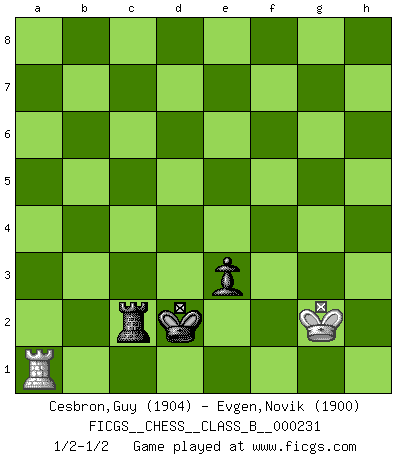Last move : 1/2-1/2 2016 November 2 13:43:47 [Event "FICGS__CHESS__CLASS_B__000231"] [Site "FICGS"] [Date "2015.09.30"] [Round "1"] [White "Cesbron,Guy"] [Black "Evgen,Novik"] [Result "1/2-1/2"] [WhiteElo "1904"] [BlackElo "1900"] 1.d4 d5 2.Nf3 Nf6 3.c4 e6 4.g3 dxc4 5.Bg2 Nc6 6.Qa4 Bb4+ 7.Bd2 Nd5 8.Bxb4 Ndxb4 9.O-O Rb8 10.Nc3 a6 11.Ne5 O-O 12.Nxc6 Nxc6 13.Bxc6 bxc6 14.Qxc4 Qd6 15.e3 Rxb2 16.Rab1 Rb6 17.Rb3 e5 18.dxe5 Qxe5 19.Rxb6 cxb6 20.Qxc6 Bh3 21.Rd1 h6 22.Nd5 Rd8 23.e4 b5 24.Qc5 Re8 25.Re1 Qb2 26.Qc3 Qxc3 27.Nxc3 Rd8 28.Nd5 Be6 29.Nb4 a5 30.Nc6 Rd2 31.Nxa5 Rxa2 32.Nc6 Rb2 33.Kg2 b4 34.Nd4 b3 35.Nxe6 fxe6 36.Re3 Kf7 37.Kf3 Kf6 38.e5+ Kg5 39.h4+ Kg6 40.Ke4 Rb1 41.Kf4 Kh5 42.Rc3 g5+ 43.hxg5 hxg5+ 44.Kf3 g4+ 45.Kf4 Rb2 46.f3 gxf3 47.g4+ Kg6 48.Kxf3 Rb1 49.Kg2 b2 50.Rb3 Kg5 51.Rb4 Kh4 52.Kh2 Re1 53.Rxb2 Kxg4 54.Kg2 Re4 55.Kf2 Kf4 56.Ra2 Rxe5 57.Ra8 Rh5 58.Ra4+ Kf5 59.Ra5+ e5 60.Ra8 Kf4 61.Ra7 Rh2+ 62.Ke1 e4 63.Ra3 Kg4 64.Ra8 Kf3 65.Rf8+ Ke3 66.Kf1 Rd2 67.Ra8 Rd1+ 68.Kg2 Ke2 69.Ra2+ Ke1 70.Ra3 Rd2+ 71.Kg1 Ke2 72.Kg2 e3 73.Ra1 Rc2 74.Ra3 Kd2 75.Ra1 Ke2 76.Ra3 Kd2 77.Ra1 1/2-1/2 Queen's pawn game Kingside Castling by player White (move 9) Kingside Castling by player Black (move 11) 10 pieces endgame at move 43 : White KRPPP , Black KRPPP WHITE : King + 1 Rook 3 Pawns BLACK : King + 1 Rook 3 Pawns 9 pieces endgame at move 46 : White KRPP , Black KRPPP WHITE : King + 1 Rook 2 Pawns BLACK : King + 1 Rook 3 Pawns 8 pieces endgame at move 48 : White KRPP , Black KRPP WHITE : King + 1 Rook 2 Pawns BLACK : King + 1 Rook 2 Pawns 7 pieces endgame at move 53 : White KRPP , Black KRP WHITE : King + 1 Rook 2 Pawns BLACK : King + 1 Rook 1 Pawn 6 pieces endgame at move 53 : White KRP , Black KRP WHITE : King + 1 Rook 1 Pawn BLACK : King + 1 Rook 1 Pawn 5 pieces endgame at move 56 : White KR , Black KRP WHITE : King + 1 Rook BLACK : King + 1 Rook 1 Pawn This chess game ended in a draw. Follow this game move after move (download)Up to this point White has been following well-known analysis. But now he makes a fatal error: he begins to use his own head. (Siegbert Tarrasch) Das Schachspiel hat wie die Liebe, die Musik, die Fähigkeit, den Menschen glücklich zu machen. Ich habe ein leises Gefühl des Bedauerns für jeden, der das Schachspiel nicht kennt, so wie ich jeden bedaure, der die Liebe nicht kennt. (Siegbert Tarrasch) El Ajedrez es un regaderazo frío para la mente. (Sir John Simon) Même un GMI sait rarement calculer sur plus de cinq coups une attaque à sacrifices. (Rudolf Spielmann) This is where the fun begins. (Anakin Skywalker in Star Wars ep.3)