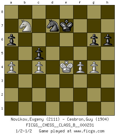 Last move : 1/2-1/2 2016 July 3 0:43:47 [Event "FICGS__CHESS__CLASS_B__000231"] [Site "FICGS"] [Date "2015.09.30"] [Round "1"] [White "Novikov,Evgeny"] [Black "Cesbron,Guy"] [Result "1/2-1/2"] [WhiteElo "2111"] [BlackElo "1904"] 1.d4 d5 2.Nf3 c6 3.Nc3 Nf6 4.Bf4 Bf5 5.e3 e6 6.h3 Nbd7 7.a3 Be7 8.Bd3 O-O 9.O-O Re8 10.Qe2 Nf8 11.Rad1 Ng6 12.Bh2 Bd6 13.Bxd6 Qxd6 14.Rfe1 Rad8 15.e4 dxe4 16.Nxe4 Nxe4 17.Bxe4 Bxe4 18.Qxe4 Qd5 19.Kh2 Qxe4 20.Rxe4 e5 21.g4 exd4 22.R1xd4 f6 23.Rxd8 Rxd8 24.Ra4 a6 25.Rd4 Rxd4 26.Nxd4 Kf7 27.Kg3 Ne5 28.b3 c5 29.Nf5 b5 30.Nd6+ Ke7 31.Nf5+ Kf7 32.f4 Nd7 33.Kf3 g6 34.Nd6+ Ke7 35.Nb7 Ke6 36.c4 bxc4 37.bxc4 f5 38.a4 fxg4+ 39.hxg4 h6 40.Ke3 Ke7 41.Ke4 1/2-1/2 Queen's pawn game Kingside Castling by player Black (move 8) Kingside Castling by player White (move 9) This chess game ended in a draw. Follow this game move after move (download)When you absolutely don't know what to do anymore, it is time to panic. (John van der Wiel) Der Freibauer hat für mich eine Seele, genau wie der Mensch, Wünsche, die unerkannt in ihm schlummern, und Befürchtungen, von deren Existenz er selbst kaum ahnt. (Aaron Nimzowitsch) Los Peones son el alma de una partida de Ajedrez. (Francois Andre Danican Philidor) Je ne crois pas en la psychologie, je crois aux bons coups. (Robert Fischer) We need strong personalities and only one world champion to attract sponsors. (Anatoly Karpov)