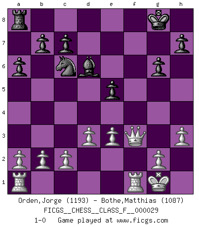 Last move : 1-0 2007 May 28 20:18:21 [Event "FICGS__CHESS__CLASS_F__000029"] [Site "FICGS"] [Date "2007.03.13"] [Round "1"] [White "Orden,Jorge"] [Black "Bothe,Matthias"] [Result "1-0"] [WhiteElo "1193"] [BlackElo "1087"] 1.e4 e5 2.Nf3 Nc6 3.Nc3 Nf6 4.Bb5 d6 5.h3 Be7 6.d3 O-O 7.O-O a6 8.Bc4 Be6 9.Bxe6 fxe6 10.Be3 d5 11.exd5 exd5 12.Ng5 Nh5 13.Ne6 Qd6 14.Nxf8 Bxf8 15.Qxh5 d4 16.Ne4 dxe3 17.Nxd6 Bxd6 18.fxe3 g6 19.Qf3 1-0 Four knights : Spanish variation Kingside Castling by player Black (move 6) Kingside Castling by player White (move 7) Player White won this chess game. Follow this game move after move (download)Don't even mention losing to me. I can't stand to think of it. (Bobby Fischer) Ich habe kein Problem mit Frauen, sondern nur mit dem Niveau ihres Schachspiels (Judith Polgar) Si el ingenio solamente fuese necesario para lucirse, las mujeres serían las mejores jugadoras de Ajedrez del mundo. (Albin) Dieu déplace le joueur, et celui-ci la pièce. Quel Dieu derrière Dieu commence donc la trame ? Arturo Perez-Reverte (prix de littérature policière 1993). First of all, we have to go back to the classical time control. (Anatoly Karpov)