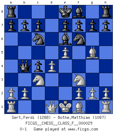 Last move : 0-1 2007 May 20 10:12:1 [Event "FICGS__CHESS__CLASS_F__000029"] [Site "FICGS"] [Date "2007.03.13"] [Round "1"] [White "Sert,Ferdi"] [Black "Bothe,Matthias"] [Result "0-1"] [WhiteElo "1288"] [BlackElo "1087"] 1.d4 d5 2.Nf3 Nf6 3.c4 dxc4 4.Nc3 Nc6 5.Bg5 Be6 6.e4 Qd6 7.e5 Qb4 0-1 This chess game has been lost on time (started : 2007.03.13 4:3:34) Queen's pawn game Player Black won this chess game. Follow this game move after move (download)Chess is really ninety nine percent calculation. (Soltis) Im Schach gibt es keinen Platz für Galanterie. (Irving Chernev) Nunca nadie ha ganado una partida de Ajedrez rindiendose. (Unknown) Des idées, des idées, j'en ai cent, j'en ai mille. Des bonnes, des mauvaises, applicables, irréalisables... Il suffit de faire le tri ! (Roos) The right perception of any matter and a misunderstanding of the same matter do not wholly exclude each other. (Kafka's the trial)