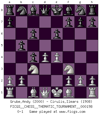 Last move : 0-1 2015 November 11 18:23:46 [Event "FICGS__CHESS__THEMATIC_TOURNAMENT__000198"] [Site "FICGS"] [Date "2015.10.01"] [Round "1"] [White "Grube,Andy"] [Black "Cirulis,Ilmars"] [Result "0-1"] [WhiteElo "2000"] [BlackElo "1908"] 1.d4 d5 2.c4 e6 3.Nc3 c6 4.Nf3 dxc4 5.e4 b5 0-1 This chess game has been lost on time (started : 2015.10.01 18:40:43) QGD : Semi-Slav, Noteboom variation Player Black won this chess game. Follow this game move after move (download)Fischer Chess play was always razor-sharp, rational and brilliant. One of the best ever. (Dave Regis) Mit Schach schule ich mein Gefühl für Geometrie, was für Tennis und Schach gleichermaßen wichtig ist. (Boris Becker) Combinaciones deslumbrantes son para la mayoría, mover madera es para los pocos. (Georg Kieninger) Les échecs sont utiles à l'exercice de la faculté de penser et à celle de l'imagination. Car nous devons posséder une méthode élaborée pour atteindre des buts partout où nous devons conduire notre raison. (Leibnitz) Lottery : A tax on people who are bad at math. (Author unknown)