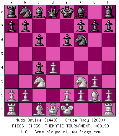 Last move : 1-0 2015 November 11 6:23:45 [Event "FICGS__CHESS__THEMATIC_TOURNAMENT__000198"] [Site "FICGS"] [Date "2015.10.01"] [Round "1"] [White "Nudo,Davide"] [Black "Grube,Andy"] [Result "1-0"] [WhiteElo "1449"] [BlackElo "2000"] 1.d4 d5 2.c4 e6 3.Nc3 c6 4.Nf3 dxc4 5.g3 Nf6 6.Bg2 1-0 This chess game has been lost on time (started : 2015.10.01 18:40:43) QGD : Semi-Slav, Noteboom variation Player White won this chess game. Follow this game move after move (download)There is only one thing Fischer does in Chess without pleasure: to lose ! (Boris Spassky) Ich habe Putins Aufstieg an die Macht beobachtet und seine Politik, die demokratischen Institutionen meines Landes zu zerstören. (Garry Kasparov) El Ajedrez es un mar en el cual un mosquito puede beber y un elefante puede bañarse. (Refrán Hindú) Celui qui prend des risques peut perdre, celui qui n'en prend pas perd toujours. (Xavier Tartacover) A good programmer is someone who always looks both ways before crossing a one-way street. (Doug Linder)