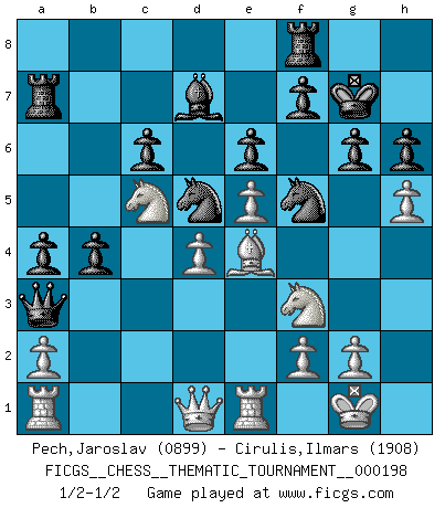 Last move : 1/2-1/2 2016 February 15 0:28:7 [Event "FICGS__CHESS__THEMATIC_TOURNAMENT__000198"] [Site "FICGS"] [Date "2015.10.01"] [Round "1"] [White "Pech,Jaroslav"] [Black "Cirulis,Ilmars"] [Result "1/2-1/2"] [WhiteElo "0899"] [BlackElo "1908"] 1.d4 d5 2.c4 e6 3.Nc3 c6 4.Nf3 dxc4 5.Bg5 Be7 6.Bxe7 Qxe7 7.e4 b5 8.e5 Nh6 9.b3 cxb3 10.Qxb3 O-O 11.Bd3 a5 12.O-O Nf5 13.Rfe1 Na6 14.Rac1 Nc7 15.Be4 Bd7 16.Bb1 a4 17.Qc2 Qa3 18.Ne4 Nd5 19.Nc5 Ra7 20.Qe4 g6 21.Qe2 b4 22.Qd2 Kg7 23.Be4 Rb8 24.Ra1 Qc3 25.Qd1 Qa3 26.h4 h6 27.h5 Rf8 1/2-1/2 QGD : Semi-Slav, Noteboom variation Kingside Castling by player Black (move 10) Kingside Castling by player White (move 12) This chess game ended in a draw. Follow this game move after move (download)An attack on the wing should be met by play in the center. (Nimzovitch) Ivan Sokolov treibt mich als Beifahrer an mit go Loeky go - . (Loek van Wely) Uno por uno, yo los acribillé, mi superioridad muy pronto se volvio aparente. (Jose Capablanca) 'L'échange des dames est un coup dur pour les deux adversaires...' Un journaliste lors d'une partie du match Spassky-Fischer If passion drives you, let reason holds the reins. (Benjamin Franklin)