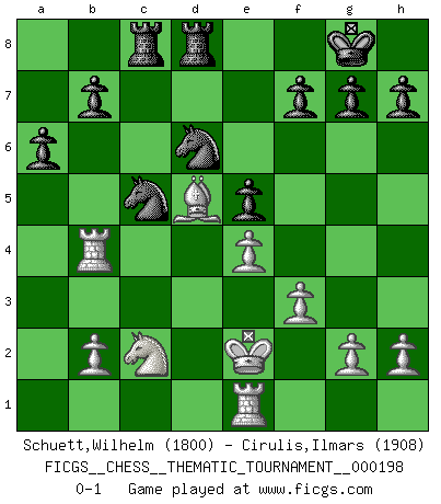 Last move : 0-1 2016 June 18 23:17:42 [Event "FICGS__CHESS__THEMATIC_TOURNAMENT__000198"] [Site "FICGS"] [Date "2015.10.01"] [Round "1"] [White "Schuett,Wilhelm"] [Black "Cirulis,Ilmars"] [Result "0-1"] [WhiteElo "1800"] [BlackElo "1908"] 1.d4 d5 2.c4 e6 3.Nc3 c6 4.Nf3 dxc4 5.a4 Nf6 6.e3 c5 7.Bxc4 cxd4 8.Qxd4 Qxd4 9.Nxd4 a6 10.Bd2 Be7 11.a5 Bd7 12.Na4 Bxa4 13.Rxa4 Nbd7 14.Ke2 Nc5 15.Rb4 Nfe4 16.Be1 Nd6 17.f3 e5 18.Nc2 Bd8 19.Bd5 Bxa5 20.Rg4 Bxe1 21.Rxe1 O-O 22.Rb4 Rfd8 23.e4 Rac8 0-1 This chess game has been lost on time (started : 2015.10.01 18:40:43) QGD : Semi-Slav, Noteboom variation Kingside Castling by player Black (move 21) Player Black won this chess game. Follow this game move after move (download)The sign of a great Master is his ability to win a won game quickly and painlessly. (Irving Chernev) Der 70jährige Viktor Kortschnoi: Die Rentenanstalt wollte mich zwingen in Rente zu gehen. Meine Frau erhält jetzt eine Pension- und ich zahle weiter in die Rentenkasse ein! (Viktor Kortschnoi) En el Ajedrez, tal como es jugado por los Maestros, practicamente la suerte es eliminada. (Emanuel Lasker) Toute estimation doit être constamment réévaluée. (Jacob Estrin) Without enthusiasm, virtue functions not at all, and vice only poorly. (Mignon McLaughlin, The Neurotic's Notebook, 1960)