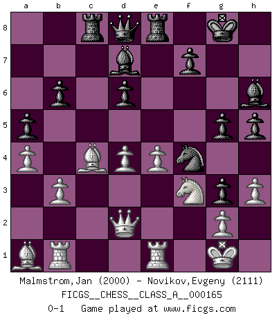Last move : 0-1 2016 January 8 19:32:29 [Event "FICGS__CHESS__CLASS_A__000165"] [Site "FICGS"] [Date "2015.10.04"] [Round "1"] [White "Malmstrom,Jan"] [Black "Novikov,Evgeny"] [Result "0-1"] [WhiteElo "2000"] [BlackElo "2111"] 1.e4 e5 2.f4 exf4 3.Bc4 Nc6 4.Nf3 g5 5.O-O h6 6.d4 d6 7.c3 Nf6 8.Nbd2 Bg7 9.h3 O-O 10.Re1 Re8 11.Bd3 a5 12.b3 b6 13.Bb5 Bd7 14.a4 Ne7 15.Bd3 Ng6 16.Qc2 Nh5 17.Rb1 Rb8 18.Nf1 c5 19.Bb2 cxd4 20.cxd4 Ng3 21.Ba1 h5 22.Nxg3 fxg3 23.Bc4 Rc8 24.Qd3 Nf4 25.Qd2 Bh6 0-1 KGA : Bishop's gambit, Maurian defense Kingside Castling by player White (move 5) Kingside Castling by player Black (move 9) Player Black won this chess game. Follow this game move after move (download)If cunning alone were needed to excel, women would be the best Chess players. (Albin) Zeige mir drei Eröffnungsvarianten und ich beweise dir, dass zwei davon inkorrekt sind. (Emanuel Lasker) Uno por uno, yo los acribillé, mi superioridad muy pronto se volvio aparente. (Jose Capablanca) Les réformistes prétendent que les progrès de la théorie conduiront à la disparition des échecs, et qu'il faut, pour leur rendre vie, en remanier les règles. En réalité, qu'exprime cette affirmation? Le mépris de l'intuition, de l'imagination et de tous les autres éléments qui font des échecs un art. (Alexander Alekhine) There will be no order, only chaos. (Sol Robeson in Pi by Darren Aronofsky)