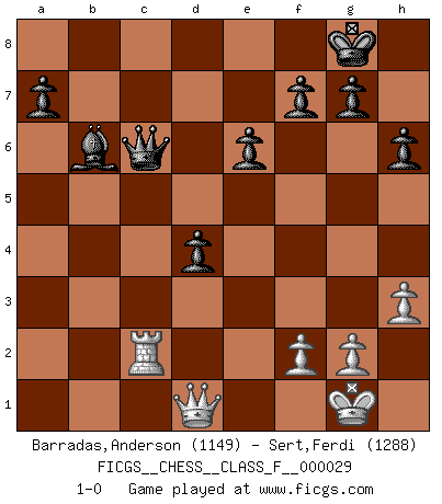 Last move : 1-0 2007 June 18 20:4:13 [Event "FICGS__CHESS__CLASS_F__000029"] [Site "FICGS"] [Date "2007.03.13"] [Round "1"] [White "Barradas,Anderson"] [Black "Sert,Ferdi"] [Result "1-0"] [WhiteElo "1149"] [BlackElo "1288"] 1.d4 Nf6 2.Nc3 d5 3.h3 c5 4.e3 Nc6 5.Bb5 e6 6.Nf3 Bd6 7.O-O O-O 8.Bxc6 bxc6 9.a3 cxd4 10.exd4 c5 11.Bg5 h6 12.Bxf6 Qxf6 13.dxc5 Bxc5 14.Nb5 Ba6 15.a4 Qxb2 16.Rb1 Qf6 17.Re1 Rfc8 18.c3 Bxb5 19.axb5 Bb6 20.Rb3 Rxc3 21.Rxc3 Qxc3 22.Ne5 Rc8 23.Nc6 Rxc6 24.bxc6 Qxc6 25.Re2 d4 26.Rc2 1-0 Queen's pawn game Kingside Castling by player White (move 7) Kingside Castling by player Black (move 7) Player White won this chess game. Follow this game move after move (download)You need not play well - just help your opponent to play badly. (Genrikh Chepukaitis) Ich verstehe den Grund nicht, warum die Aufteilung in Frauen und Männer überhaupt im Schach besteht. (Judith Polgar) No existe un remordimiento como el remordimiento del Ajedrez. (H. G. Wells) Les sacrifices démontrent seulement que quelqu'un a gaffé. (Savielly Tartacover) Those who make the worst use of their time are the first to complain of its brevity. (Jean de la Bruyere)