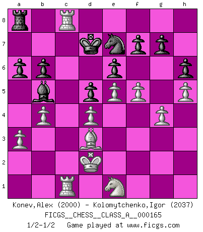 Last move : 1/2-1/2 2016 February 12 14:54:41 [Event "FICGS__CHESS__CLASS_A__000165"] [Site "FICGS"] [Date "2015.10.04"] [Round "1"] [White "Konev,Alex"] [Black "Kolomytchenko,Igor"] [Result "1/2-1/2"] [WhiteElo "2000"] [BlackElo "2037"] 1.e4 e6 2.d4 d5 3.Nc3 Nf6 4.Bg5 Be7 5.e5 Nfd7 6.h4 c5 7.Bxe7 Kxe7 8.f4 Qb6 9.Qd2 Nc6 10.Na4 Qb4 11.Nxc5 Nxc5 12.c3 Ne4 13.cxb4 Nxd2 14.Kxd2 Nxb4 15.Nf3 Bd7 16.h5 h6 17.a3 Nc6 18.b4 a6 19.Bd3 Rhb8 20.Rhc1 Ke8 21.g4 Ne7 22.Ne1 Rc8 23.Rc5 Bb5 24.Rac1 Kd7 25.f5 b6 26.Rxc8 1/2-1/2 French : Albin-Alekhine-Chatard attack, Breyer variation This chess game ended in a draw. Follow this game move after move (download)Chess is a part of culture and if a culture is declining then Chess too will decline. (Mikhail Botvinnik) Im Internet Chess Club betrug mein Rating vorübergehend 3350 ELO-Punkte. (Sergej Karjakin) El Peón aislado arroja penumbra sobre todo el tablero. (Aaron Nimzovich) La vie est comme un jeu d'échecs : nous esquissons un plan, mais celui-ci est tributaire de ce que daignent faire l'adversaire aux échecs et le destin dans la vie. (Arthur Schopenhauer) A person who never made a mistake never tried anything new. (Albert Einstein)