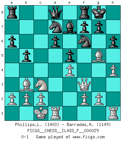 Last move : 0-1 2007 June 8 18:48:31 [Event "FICGS__CHESS__CLASS_F__000029"] [Site "FICGS"] [Date "2007.03.13"] [Round "1"] [White "Phillips,Lucas"] [Black "Barradas,Anderson"] [Result "0-1"] [WhiteElo "1400"] [BlackElo "1149"] 1.e4 c5 2.Nf3 d6 3.d4 cxd4 4.Nxd4 Nf6 5.Nc3 e5 6.Nf3 Bg4 7.Bc4 a6 8.Bg5 Be7 9.h3 Bxf3 10.Qxf3 Nbd7 11.O-O-O O-O 12.h4 b5 13.Bb3 h6 0-1 This chess game has been lost on time (started : 2007.03.13 4:3:34) Sicilian Queenside Castling by player White (move 11) Kingside Castling by player Black (move 11) Player Black won this chess game. Follow this game move after move (download)I have added these principles to the law: get the Knights into action before both Bishops are developed. (Emanuel Lasker) Offener Brief an US-Präsident Bush anlässlich der Verhaftung Bobby Fishers: Verhaften Sie mich. Stecken Sie mich in dieselbe Zelle wie Bobby Fisher und geben Sie uns ein Schachspiel mit. (Boris Vassilievich Spassky) Estaba muy claro de que el punto vulnerable del Gran Maestro Americano (Bobby Fischer) radicaba en las posiciones de doble filo, colgantes, irracionales, donde el siempre falló en encontrar un triunfo aún en una posición de clara victoria. (Efim Geller) Vous savez, camarade Pachman, je n'éprouve pas de plaisir à être ministre, je jouerais plutôt aux échecs comme vous, ou alors ferais une révolution au Venezuela. (Che Guevara à Ludek Pachman, 'Checkmate in Prague', 1975) Information on the Internet is subject to the same rules and regulations as conversation at a bar. (George Lundberg)
