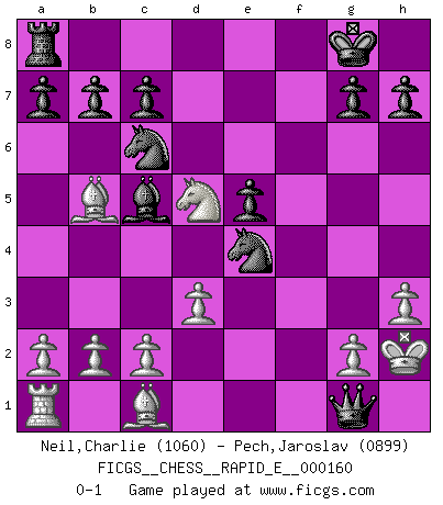 Last move : 0-1 2015 November 28 0:32:44 [Event "FICGS__CHESS__RAPID_E__000160"] [Site "FICGS"] [Date "2015.10.06"] [Round "1"] [White "Neil,Charlie"] [Black "Pech,Jaroslav"] [Result "0-1"] [WhiteElo "1060"] [BlackElo "0899"] 1.e4 e5 2.Nf3 Nc6 3.Bb5 f5 4.Nc3 fxe4 5.Nxe4 d5 6.Nc3 Bg4 7.h3 Bxf3 8.Qxf3 Nf6 9.O-O Bc5 10.Re1 O-O 11.d3 Ne4 12.Qxf8+ Qxf8 13.Nxd5 Qxf2+ 14.Kh2 Qg3+ 15.Kh1 Qxe1+ 16.Kh2 Qg1+ 0-1 Ruy Lopez : Schliemann defense, Berger variation Kingside Castling by player White (move 9) Kingside Castling by player Black (move 10) Player Black won this chess game. Follow this game move after move (download)Chess is the art of analysis. (Mikhail Botvinnik) Frage des Reporters: -Welche besonderen Umstände rechtfertigen das Anhalten der Uhren während einer Turnierpartie? Antwort: -Einen Fotographen zu strangulieren. (Siegbert Tarrasch) Prefiero perder una partida realmente buena, que ganar una mala. (David Levy) Pour se monter efficace, un Cavalier a besoin d'avant-postes ! Les Cavaliers font les meilleurs bloqueurs de pions passés. Man with more than one clock never knows what time it is. (Chinese thought)