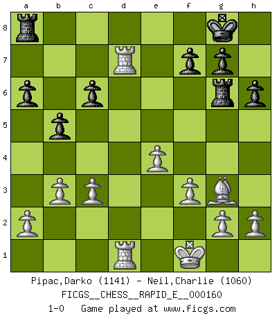 Last move : 1-0 2015 November 2 0:2:45 [Event "FICGS__CHESS__RAPID_E__000160"] [Site "FICGS"] [Date "2015.10.06"] [Round "1"] [White "Pipac,Darko"] [Black "Neil,Charlie"] [Result "1-0"] [WhiteElo "1141"] [BlackElo "1060"] 1.e4 e5 2.Nf3 Nc6 3.Bb5 a6 4.Bxc6 dxc6 5.d4 exd4 6.Qxd4 Qxd4 7.Nxd4 Bc5 8.c3 Ne7 9.O-O O-O 10.Bf4 Bb6 11.Nd2 Ng6 12.Bg3 Bd7 13.Nc4 Rfe8 14.Nxb6 cxb6 15.Rfe1 b5 16.Rad1 Rad8 17.Kf1 Ne5 18.b3 Ng6 19.f3 h6 20.Nf5 Nf8 21.Nd6 Re6 22.Nxb7 Rde8 23.Nc5 Rg6 24.Nxd7 Nxd7 25.Rxd7 Ra8 26.Red1 1-0 Ruy Lopez : Exchange variation Kingside Castling by player White (move 9) Kingside Castling by player Black (move 9) Player White won this chess game. Follow this game move after move (download)Nothing excites jaded Grandmasters more than a theoretical novelty. (Dominic Lawson) Ich tröste mich mit dem Vergnügen, daß Schachfans, Zuschauer und Leser glücklich sind, wenn ein Großmeister etwas riskiert, statt nur Klötzchen zu schieben. (Mikhail Nekhemyevich Tal) El Ajedrez se juega con la mente... ¡no con las manos!. (Renaud y Kahn) La vie et les Echecs sont tous les deux une lutte constante. (Lasker) May the force be with you. (Han Solo in Star Wars ep.4)