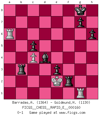 Last move : 0-1 2015 October 27 19:6:17 [Event "FICGS__CHESS__RAPID_E__000160"] [Site "FICGS"] [Date "2015.10.06"] [Round "1"] [White "Barradas,Anderson"] [Black "Goldmund,Heike"] [Result "0-1"] [WhiteElo "1364"] [BlackElo "1130"] 1.e4 d5 2.exd5 Qxd5 3.Nc3 Qa5 4.Nf3 Nf6 5.d3 Bf5 6.Be2 e6 7.O-O c6 8.Bd2 Qc7 9.h3 Bd6 10.Nd4 Bg6 11.Nf3 Nbd7 12.Re1 O-O 13.Nh2 Bxh2+ 14.Kh1 Bd6 15.Bf3 Rad8 16.Bg5 h6 17.Bxf6 Nxf6 18.Qe2 Rfe8 19.Ne4 Nxe4 20.Bxe4 Bxe4 21.Qxe4 Qb6 22.b3 Qxf2 23.c4 Qg3 24.Kg1 Qh2+ 25.Kf1 Qh1+ 26.Ke2 Qh2 27.Rf1 Qe5 28.Rab1 Qxe4+ 29.dxe4 Bb4 30.Ke3 Rd2 31.a3 Bc3 32.Rf3 Rxg2 33.Rd1 f5 34.Rd3 Bf6 35.Rd7 Rb8 36.exf5 e5 37.Rf1 Rg3+ 38.Ke2 Rxh3 39.Rb1 e4 40.a4 c5 41.Rc7 Bd4 42.Rd7 Rf3 43.Re7 Rf4 44.a5 e3 45.Rg1 Rxf5 46.a6 bxa6 47.Rxa7 Rxb3 48.Rxa6 Rf2+ 0-1 Scandinavian (centre counter) defense Kingside Castling by player White (move 7) Kingside Castling by player Black (move 12) Player Black won this chess game. Follow this game move after move (download)The Pawns are the soul of the game. (Francois Andre Danican Philidor) Lisa Lane, amerikanische Schachmeisterin, hatte Fischer einmal als stärksten lebenden Spieler bezeichnet. Antwort: Das ist richtig, aber Lisa Lane ist eigentlich nicht in der Lage, das zu beurteilen. (Robert James Fischer) El Ajedrez es un terrible juego. Si no controlas el centro, tu oponente tiene una posición mas holgada. Si tienes control del centro, ¡entonces realmente tu tienes algo de que preocuparte!. (Siegbert Tarrasch) Le système Elo représente seulement une moyenne. Il est simplement un indicateur de votre stabilité. (Anatoli Karpov) The ultimate in disposing one's troops is to be without ascertainable shape. Then the most penetrating spies cannot pry in nor can the wise lay plans against you. (Sun Tzu)