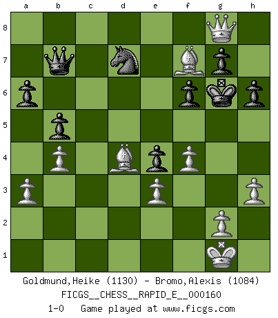 Last move : 1-0 2015 October 25 19:15:11 [Event "FICGS__CHESS__RAPID_E__000160"] [Site "FICGS"] [Date "2015.10.06"] [Round "1"] [White "Goldmund,Heike"] [Black "Bromo,Alexis"] [Result "1-0"] [WhiteElo "1130"] [BlackElo "1084"] 1.b4 e5 2.Bb2 d6 3.c4 Nf6 4.e3 h6 5.d3 Bg4 6.Nf3 Nbd7 7.Be2 Be7 8.O-O c6 9.Nbd2 O-O 10.Qc2 a6 11.h3 Bxf3 12.Nxf3 Re8 13.a3 b5 14.cxb5 cxb5 15.Nh4 d5 16.Nf5 e4 17.dxe4 dxe4 18.Nxe7+ Qxe7 19.Rfd1 Rad8 20.Rd4 Ne5 21.Rad1 Rxd4 22.Bxd4 Rd8 23.Bc5 Rxd1+ 24.Qxd1 Qb7 25.Qd8+ Kh7 26.Bd4 Nfd7 27.f4 Nc4 28.Bxc4 f6 29.Qg8+ Kg6 30.Bf7+ 1-0 Polish (Sokolsky) opening Kingside Castling by player White (move 8) Kingside Castling by player Black (move 9) Player White won this chess game. Follow this game move after move (download)We cannot resist the fascination of sacrifice, since a passion for sacrifices is part of a Chessplayer's nature. (Rudolf Spielman) Kritik überlasse ich den Spießern. Ich zeige nichts, wofür ich mich schämen muss. (Alexandra Kosteniuk) El pensamiento metódico es mas útil en el Ajedrez que la inspiración. (C. J. S. Purdy) À la honte des hommes, on sait que les lois du jeu sont les seules qui soient partout justes, claires, inviolables et exécutées. Pourquoi l'Indien qui a donné les règles du jeu d'échecs est-il obéi de bon gré dans toute la terre, et que les décrétales des papes, par exemple, sont aujourd'hui un objet d'horreur et de mépris ? C'est que l'inventeur des échecs combina tout avec justesse pour la satisfaction des joueurs, et que les papes, dans leurs décrétales, n'eurent en vue que leur seul avantage. L'Indien voulut exercer également l'esprit des hommes et leur donner du plaisir; les papes ont voulu abrutir l'esprit des hommes. Voltaire (Dictionnaire philosophique / Garnier 1967) Panic is a sudden desertion of us, an a going over to the enemy of our imagination. (Christian Nevell Bovee)