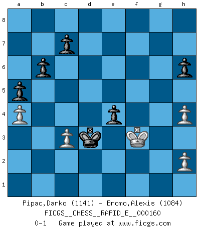 Last move : 0-1 2015 November 14 20:29:1 [Event "FICGS__CHESS__RAPID_E__000160"] [Site "FICGS"] [Date "2015.10.06"] [Round "1"] [White "Pipac,Darko"] [Black "Bromo,Alexis"] [Result "0-1"] [WhiteElo "1141"] [BlackElo "1084"] 1.e4 e5 2.Nf3 Nc6 3.a3 a6 4.Nc3 Nf6 5.d4 d6 6.dxe5 dxe5 7.Qxd8+ Kxd8 8.Bg5 Be7 9.Bxf6 Bxf6 10.Nd5 Be6 11.Nxf6 gxf6 12.Be2 f5 13.exf5 Bxf5 14.Rd1+ Ke7 15.O-O Rad8 16.c3 e4 17.Ng5 h6 18.Nh3 Bxh3 19.gxh3 Rhg8+ 20.Kh1 Ne5 21.f4 Ng6 22.Rxd8 Rxd8 23.Re1 Nxf4 24.Bg4 Rd2 25.Rxe4+ Ne6 26.Bxe6 fxe6 27.Rb4 b6 28.a4 a5 29.Rb3 Kd6 30.c4 Rc2 31.Rc3 Rxc3 32.bxc3 Kc5 33.Kg2 Kxc4 34.Kg3 e5 35.Kf3 Kd3 36.h4 e4+ 0-1 King's pawn game Kingside Castling by player White (move 15) Player Black won this chess game. Follow this game move after move (download)I know people who have all the will in the world, but still can't play good Chess. (Bobby Fischer) Ich moechte nie einem Club beitreten, der Leute wie mich als Mitglieder aufnimmt. (Woody Allen) Cuando veas una buena jugada, trata de encontrar otra mejor. (Emanuel Lasker) Votre prénom est 'Tactique', votre deuxième prénom est 'Tactique' et votre nom est 'Tactique'. (Ken Smith) All art requires courage. (Anne Tucker)