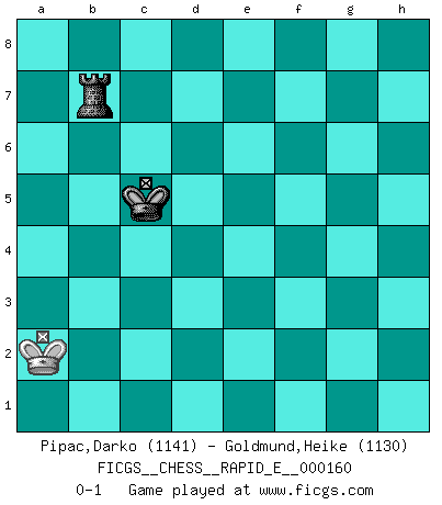 Last move : 0-1 2015 December 14 18:36:35 [Event "FICGS__CHESS__RAPID_E__000160"] [Site "FICGS"] [Date "2015.10.06"] [Round "1"] [White "Pipac,Darko"] [Black "Goldmund,Heike"] [Result "0-1"] [WhiteElo "1141"] [BlackElo "1130"] 1.e4 d5 2.exd5 Qxd5 3.Nc3 Qa5 4.h3 Nf6 5.d4 Bf5 6.a3 c6 7.Nf3 e6 8.Bg5 Be7 9.Bxf6 Bxf6 10.Bd3 Nd7 11.O-O Bxd3 12.Qxd3 O-O 13.Ne2 Rfd8 14.c3 b5 15.Ng3 c5 16.d5 c4 17.Qd2 Ne5 18.Nxe5 Bxe5 19.Qe3 Bxg3 20.fxg3 Rxd5 21.Qf3 Qc7 22.Rad1 Rad8 23.g4 Qc5+ 24.Kh1 f6 25.Rfe1 e5 26.Rc1 Qb6 27.Rcd1 Rd3 28.Rxd3 cxd3 29.Rd1 d2 30.Qe2 Qd6 31.b4 a6 32.Qe3 Qd3 33.Qb6 Qd6 34.Qxd6 Rxd6 35.Kg1 Rd3 36.Kf2 e4 37.Ke2 Rxc3 38.Rxd2 Rxa3 39.Rd6 Kf7 40.Rb6 g6 41.Rb7+ Ke6 42.Rxh7 Rb3 43.Ra7 Ra3 44.h4 Ke5 45.Rg7 Rb3 46.Rxg6 Rxb4 47.Rh6 a5 48.g5 fxg5 49.hxg5 Rb2+ 50.Ke3 Rxg2 51.g6 Rg5 52.Ke2 Kf6 53.Ke3 a4 54.Kxe4 a3 55.Rh3 b4 56.Kd4 a2 57.Rh1 b3 58.Kc3 Rg3+ 59.Kb2 Kxg6 60.Ra1 Kf5 61.Rc1 Ke4 62.Rc4+ Kd5 63.Rb4 Rg2+ 64.Ka1 Rg3 65.Kb2 Kc5 66.Rxb3 Rxb3+ 67.Kxa2 Rb7 0-1 Scandinavian (centre counter) defense Kingside Castling by player White (move 11) Kingside Castling by player Black (move 12) 10 pieces endgame at move 48 : White KRPP , Black KRPPPP WHITE : King + 1 Rook 2 Pawns BLACK : King + 1 Rook 4 Pawns 9 pieces endgame at move 49 : White KRPP , Black KRPPP WHITE : King + 1 Rook 2 Pawns BLACK : King + 1 Rook 3 Pawns 8 pieces endgame at move 50 : White KRP , Black KRPPP WHITE : King + 1 Rook 1 Pawn BLACK : King + 1 Rook 3 Pawns 7 pieces endgame at move 54 : White KRP , Black KRPP WHITE : King + 1 Rook 1 Pawn BLACK : King + 1 Rook 2 Pawns 6 pieces endgame at move 59 : White KR , Black KRPP WHITE : King + 1 Rook BLACK : King + 1 Rook 2 Pawns 5 pieces endgame at move 66 : White KR , Black KRP WHITE : King + 1 Rook BLACK : King + 1 Rook 1 Pawn 4 pieces endgame at move 66 : White K , Black KRP WHITE : King + BLACK : King + 1 Rook 1 Pawn 3 pieces endgame at move 67 : White K , Black KR WHITE : King + BLACK : King + 1 Rook Player Black won this chess game. Follow this game move after move (download)When asked, -How is that you pick better moves than your opponents?, I responded: I'm very glad you asked me that, because, as it happens, there is a very simple answer. I think up my own moves, and I make my opponent think up his. (Alexander Alekhine) Irgendwie scheint mir sonntags früh um 9 Uhr der Killerinstinkt verloren gegangen zu sein. (Alexej Shirov) La captura del Rey enemigo es la finalidad pero no el primer objetivo de la partida. (William Steinitz) Le jeu d'échecs est comme rejeté hors du temps. (Antoine de Saint-Exupéry) The right perception of any matter and a misunderstanding of the same matter do not wholly exclude each other. (Kafka's the trial)