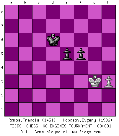 Last move : 0-1 2015 October 19 15:13:36 [Event "FICGS__CHESS__NO_ENGINES_TOURNAMENT__000081"] [Site "FICGS"] [Date "2015.10.06"] [Round "1"] [White "Ramos,Francis"] [Black "Kopasov,Evgeny"] [Result "0-1"] [WhiteElo "1451"] [BlackElo "1986"] 1.e4 c5 2.Nf3 d6 3.d4 cxd4 4.Nxd4 Nf6 5.Nc3 a6 6.Be3 e5 7.Nb3 Be6 8.f3 Be7 9.Nd5 Nxd5 10.exd5 Bf5 11.Bd3 Bxd3 12.Qxd3 Nd7 13.O-O O-O 14.f4 Rc8 15.f5 Bg5 16.c3 Bxe3+ 17.Qxe3 Nf6 18.Rad1 Qc7 19.h3 a5 20.Rf3 a4 21.Nc1 Qc5 22.Qxc5 Rxc5 23.Rfd3 h5 24.b3 axb3 25.axb3 b5 26.Ne2 Ra8 27.Rc1 Ra3 28.Rb1 Rxd5 29.Rxd5 Nxd5 30.Rd1 Nf6 31.Rxd6 Rxb3 32.Rc6 Kf8 33.Kf2 Ke7 34.Rc7+ Nd7 35.Ke3 Kd6 36.Rc8 Nf6 37.Kd3 Rb1 38.Rf8 Ke7 39.Rc8 Rf1 40.Rc5 Rxf5 41.Ng3 Rg5 42.Ne4 Nxe4 43.Kxe4 Kd6 44.Rxb5 Rxg2 45.Rb7 f6 46.Kf3 Rc2 47.Rxg7 Rxc3+ 48.Kg2 h4 49.Rg4 Rg3+ 50.Rxg3 hxg3 51.Kxg3 f5 0-1 Sicilian : Najdorf, Byrne (English) attack Kingside Castling by player White (move 13) Kingside Castling by player Black (move 13) 10 pieces endgame at move 44 : White KRPP , Black KRPPPP WHITE : King + 1 Rook 2 Pawns BLACK : King + 1 Rook 4 Pawns 9 pieces endgame at move 47 : White KRPP , Black KRPPP WHITE : King + 1 Rook 2 Pawns BLACK : King + 1 Rook 3 Pawns 8 pieces endgame at move 47 : White KRP , Black KRPPP WHITE : King + 1 Rook 1 Pawn BLACK : King + 1 Rook 3 Pawns 7 pieces endgame at move 50 : White KRP , Black KPPP WHITE : King + 1 Rook 1 Pawn BLACK : King + 3 Pawns 6 pieces endgame at move 50 : White KP , Black KPPP WHITE : King + 1 Pawn BLACK : King + 3 Pawns 5 pieces endgame at move 51 : White KP , Black KPP WHITE : King + 1 Pawn BLACK : King + 2 Pawns Player Black won this chess game. Follow this game move after move (download)Weak points or holes in the opponent's position must be occupied by pieces not Pawns. (Siegbert Tarrasch) Der Partner hat auch seine Existenzberechtigung. (Savielly Grigorievitsch Tartakower) Para mi, el Ajedrez es la vida y cada partida es como una nueva vida. Todo jugador de Ajedrez suele vivir muchas vidas durante su vida. (Eduard Gufeld) Lorsque vous vous retrouvez devant une position atroce, ne tendez pas un ultime piège dérisoire avec l'intention d'abandonner si l'adversaire le déjoue ! Faites-vous plutôt un devoir de résister comme si votre vie en dépendait. Jouez le coup qui vous déplairait au centuple si vous étiez dans la peau de votre tortionnaire ! Go and wake up your luck. (Persian saying)