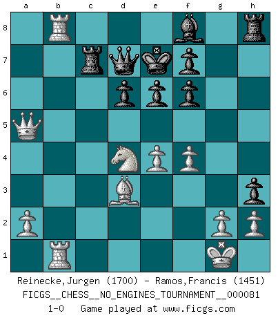 Last move : 1-0 2015 November 6 17:17:32 [Event "FICGS__CHESS__NO_ENGINES_TOURNAMENT__000081"] [Site "FICGS"] [Date "2015.10.06"] [Round "1"] [White "Reinecke,Jurgen"] [Black "Ramos,Francis"] [Result "1-0"] [WhiteElo "1700"] [BlackElo "1451"] 1.e4 c5 2.Nf3 d6 3.d4 cxd4 4.Nxd4 Nf6 5.Nc3 e6 6.Bg5 a6 7.f4 Qb6 8.Qd2 Qxb2 9.Rb1 Qa3 10.Bxf6 gxf6 11.Rb3 Qc5 12.Be2 h5 13.Na4 Qc7 14.Nb6 Ra7 15.Nxc8 Qxc8 16.O-O b5 17.Rfb1 Rc7 18.c4 h4 19.cxb5 axb5 20.Bxb5+ Ke7 21.Bd3 h3 22.Rxb8 Qd7 23.Qa5 1-0 Sicilian : Scheveningen variation Kingside Castling by player White (move 16) Player White won this chess game. Follow this game move after move (download)Checkers is for tramps. (Paul Morphy) Man wirke der falschen Auffassung entgegen, als ob jeder Zug Unmittelbares zu leisten habe; auch Werte- und Ruhezüge haben ihre Existenzberechtigung. (Aaron Nimzowitsch) Yo he agregado estos principios a la ley: pongan los Caballos en acción antes de que los dos Alfiles sean desarrollados. (Emanuel Lasker) Un footballeur joue avec ses pieds, parfois avec sa tête. Un joueur d'échecs ne joue qu'avec sa tête. Et quand il ne joue plus, il meurt. (Jacob Murray) You have to believe in yourself. (Sun Tzu)