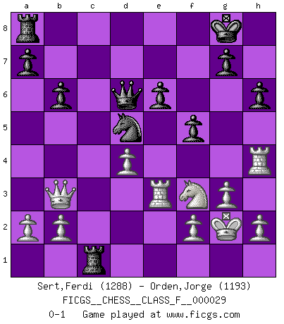 Last move : 0-1 2007 June 18 14:3:11 [Event "FICGS__CHESS__CLASS_F__000029"] [Site "FICGS"] [Date "2007.03.13"] [Round "1"] [White "Sert,Ferdi"] [Black "Orden,Jorge"] [Result "0-1"] [WhiteElo "1288"] [BlackElo "1193"] 1.Nf3 Nf6 2.d4 d5 3.c4 e6 4.Nc3 Bb4 5.Bg5 O-O 6.Rc1 c6 7.e3 Bxc3+ 8.Rxc3 h6 9.Bxf6 Qxf6 10.Bd3 Nd7 11.O-O dxc4 12.Rxc4 Nb6 13.Rc5 Nd7 14.Ra5 b6 15.Rh5 c5 16.Qa4 cxd4 17.exd4 Qf4 18.Rh4 Qd6 19.Re1 Bb7 20.Be4 Bxe4 21.R1xe4 f5 22.Re3 Rfc8 23.g3 Rc1+ 24.Kg2 Nf6 25.Qb3 Nd5 0-1 Reti Opening Kingside Castling by player Black (move 5) Kingside Castling by player White (move 11) Player Black won this chess game. Follow this game move after move (download)I like the moment when I break a man's ego. (Bobby Fischer) Der Partner hat auch seine Existenzberechtigung. (Savielly Grigorievitsch Tartakower) Juega la Apertura como un libro, el Juego Medio como un mago y los Finales como una máquina. (Spielmann) Je menace de comprendre la position. (Anonyme) In every real man a child is hidden that wants to play. (Friedrich Nietzsche)