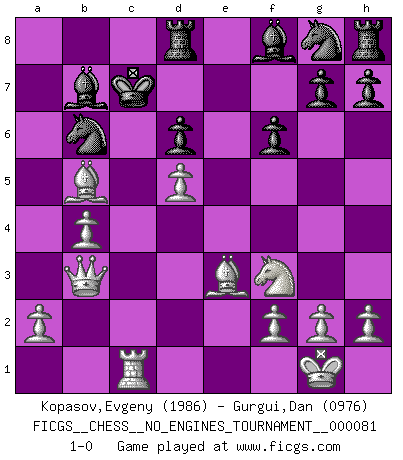 Last move : 1-0 2015 November 3 19:6:29 [Event "FICGS__CHESS__NO_ENGINES_TOURNAMENT__000081"] [Site "FICGS"] [Date "2015.10.06"] [Round "1"] [White "Kopasov,Evgeny"] [Black "Gurgui,Dan"] [Result "1-0"] [WhiteElo "1986"] [BlackElo "0976"] 1.d4 d6 2.c4 c6 3.Nc3 Nd7 4.e4 b6 5.Nf3 Bb7 6.Be2 e6 7.O-O Qc7 8.Be3 O-O-O 9.Qa4 a6 10.b4 b5 11.cxb5 cxb5 12.Qb3 f6 13.Rfc1 Bc6 14.d5 exd5 15.exd5 Bb7 16.Nxb5 axb5 17.Rxc7+ Kxc7 18.Bxb5 Nb6 19.Rc1+ 1-0 Old Indian defense Kingside Castling by player White (move 7) Queenside Castling by player Black (move 8) Player White won this chess game. Follow this game move after move (download)Fischer was a master of clarity and a king of artful positioning. His opponents would see where he was going but were powerless to stop him. (Bruce Pandolfini) Frage des Reporters: -Welche besonderen Umstände rechtfertigen das Anhalten der Uhren während einer Turnierpartie? Antwort: -Einen Fotographen zu strangulieren. (Siegbert Tarrasch) Después de la respuesta de las negras a 1.e4 con 1..e5, se quedan siempre tratando de entrar dentro del juego. (Howard Staunton) Comme les marins qui ont mille raisons différentes d'aller en mer, les joueurs d'échecs en ont tout autant avant de s'installer devant une table et jouer... (Vincent Bertignac, philosophe) The only thing that matters is the evidence. (Horatio Caine, C.S.I. Miami)