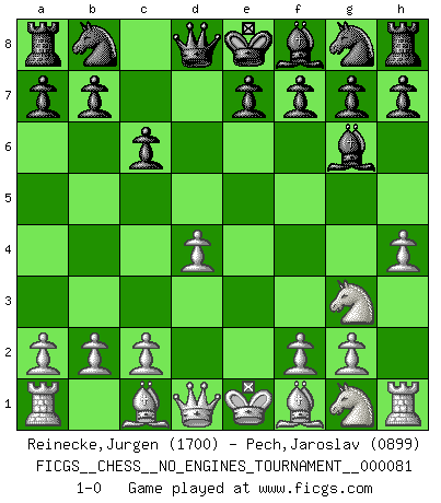 Last move : 1-0 2015 November 17 10:47:32 [Event "FICGS__CHESS__NO_ENGINES_TOURNAMENT__000081"] [Site "FICGS"] [Date "2015.10.06"] [Round "1"] [White "Reinecke,Jurgen"] [Black "Pech,Jaroslav"] [Result "1-0"] [WhiteElo "1700"] [BlackElo "0899"] 1.e4 c6 2.d4 d5 3.Nd2 dxe4 4.Nxe4 Bf5 5.Ng3 Bg6 6.h4 1-0 Caro-Kann : 3.Nd2 Player White won this chess game. Follow this game move after move (download)Could we look into the head of a Chess player, we should see there a whole world of feelings, images, ideas, emotion and passion. (Alfred Binet) Es ist besser die Steine des Gegners zu opfern. (Savielly Grigorievitsch Tartakower) La vida es como el Ajedrez, con lucha, competición y eventos buenos y malos. (Benjamin Franklin) Shah mat. Le roi est mort. Cri de fierté d'un joueur venant de terrasser son adversaire, courtoisement, sans effusion de sang. Real knowledge is to know the extent of one's ignorance. (Confucius)